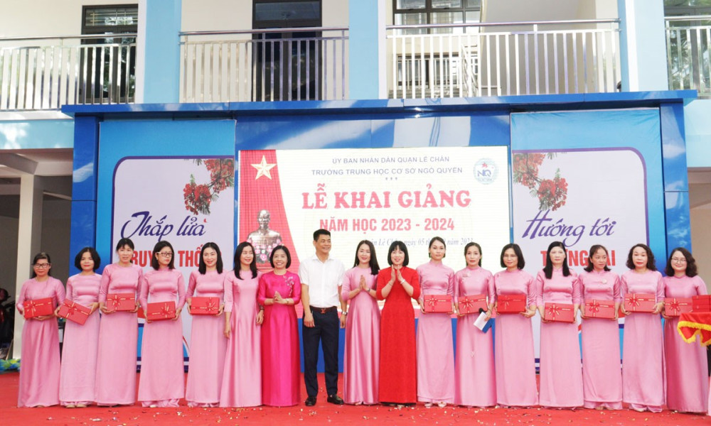 Nhân dịp này, Trường THCS Ngô Quyền đã biểu dương, khen thưởng giáo viên có thành tích cao trong công tác ôn thi vào lớp 10 THPT năm học 2023-2024 và tặng quà cho các em học sinh có hoàn cảnh khó khăn.