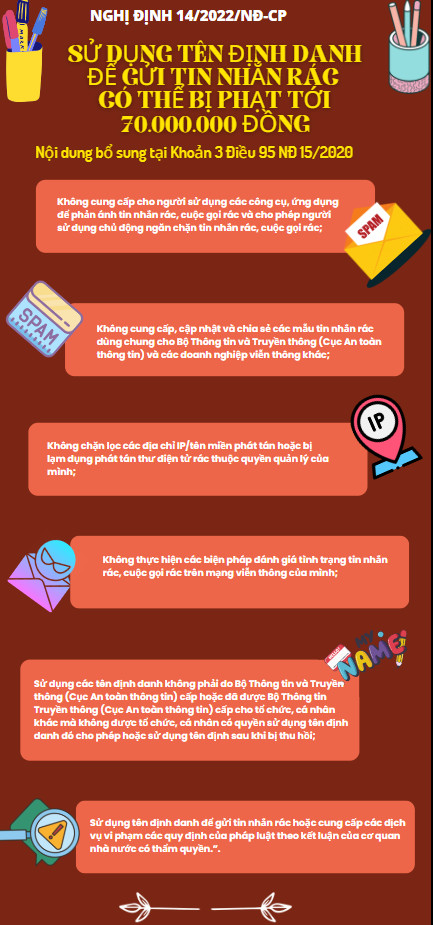 q) Sử dụng tên định danh để gửi tin nhắn rác hoặc cung cấp các dịch vụ vi phạm các quy định của pháp luật theo kết luận của cơ quan nhà nước có thẩm quyền.”