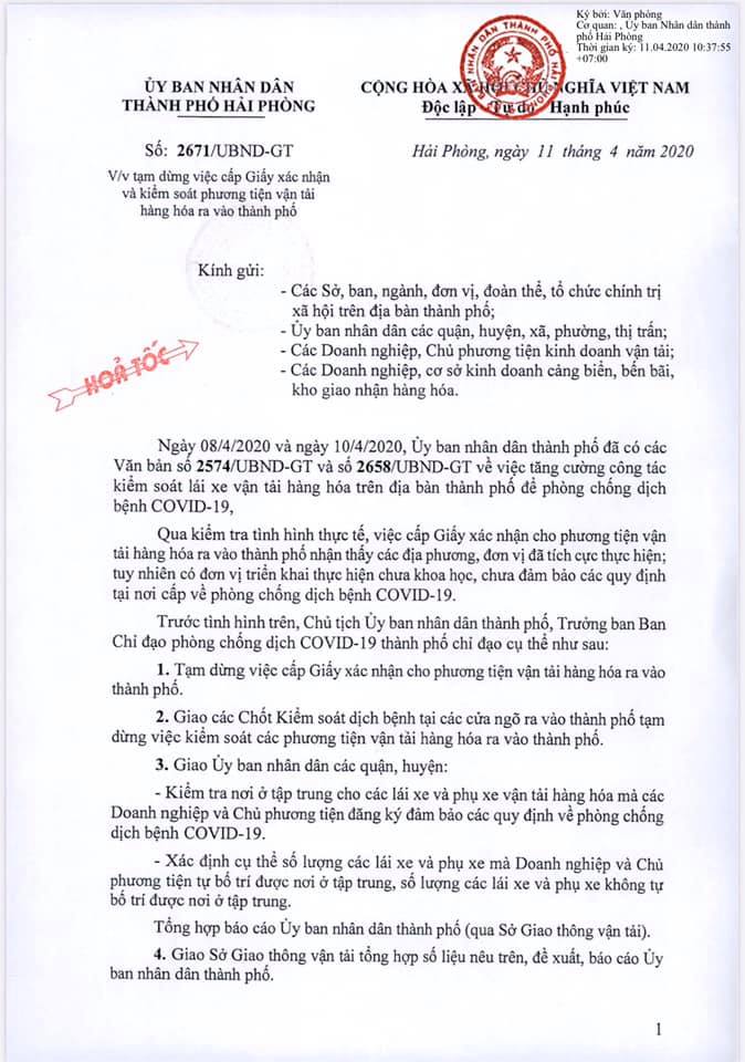 Ngày 8/4/2020 và ngày 10/4/2020, UBND thành phố đã có các Văn bản số 2574/UBND-GT và số 2658/UBND-GT về việc tăng cường công tác kiểm soát lái xe vận tải hàng hóa trên địa bàn thành phố để phòng chống dịch bệnh Covid-19.