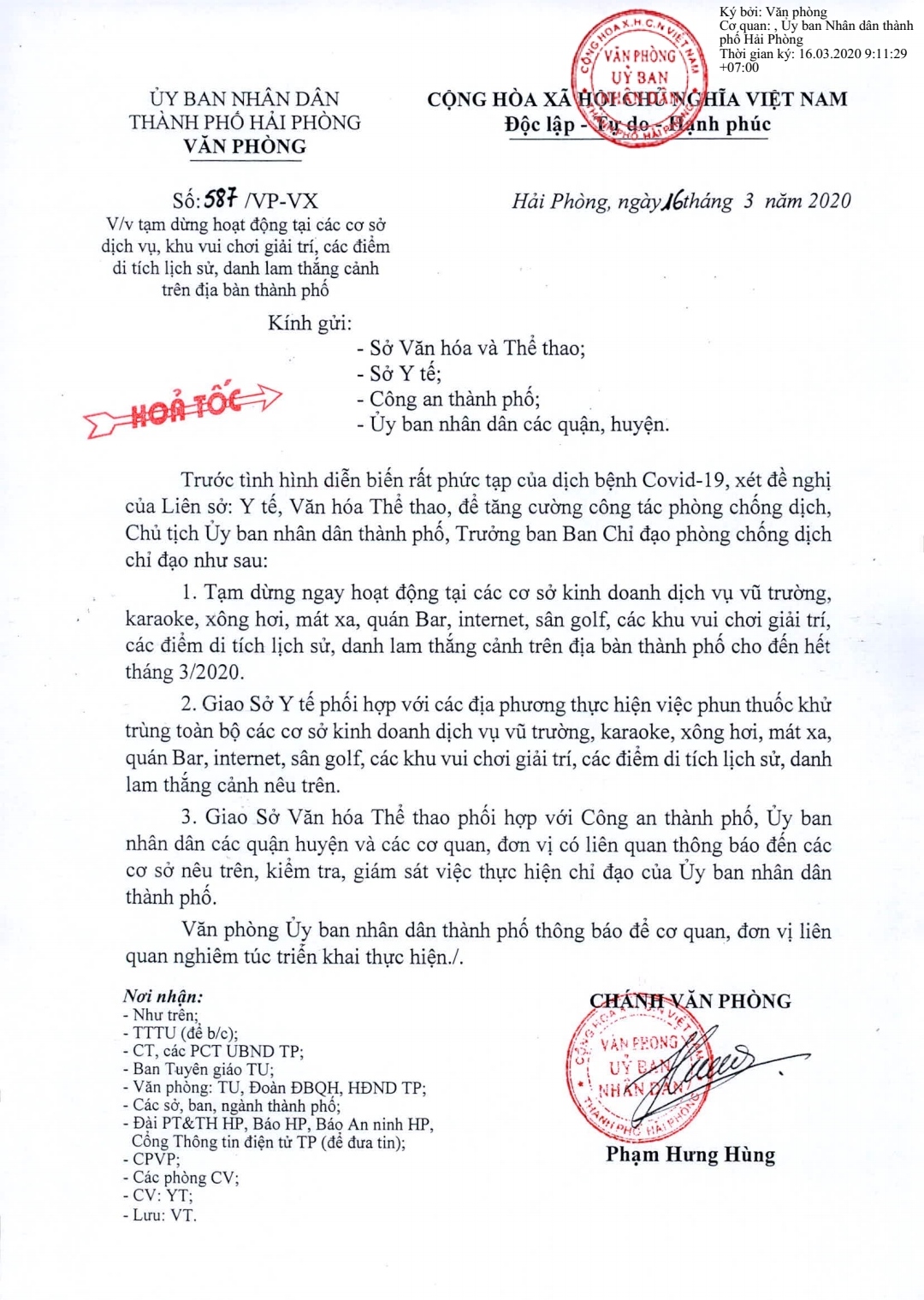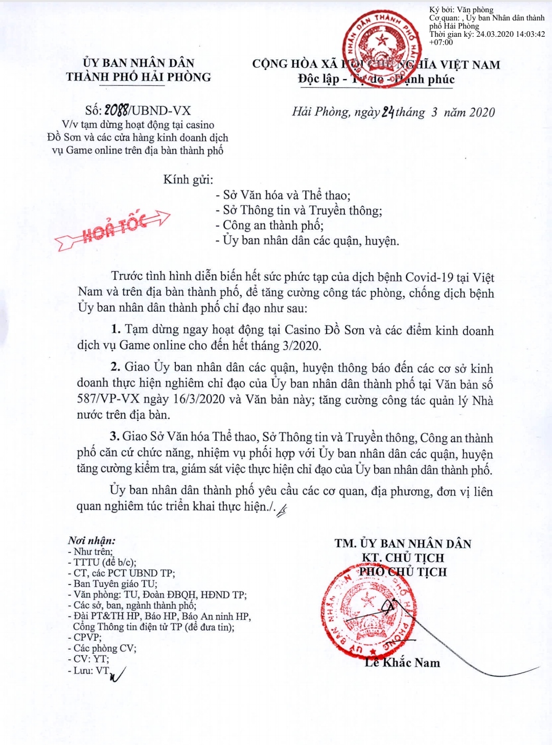 Trước tình hình diễn biến hết sức phức tạp của dịch bệnh COVID-19 tại Việt Nam và trên địa bàn thành phố, để tăng cường công tác phòng, chống dịch bệnh, UBND thành phố chỉ đạo: Tạm dừng ngay hoạt động tại Casino Đồ Sơn và các điểm kinh doanh dịch vụ Game Online cho đến hết tháng 3/2020.