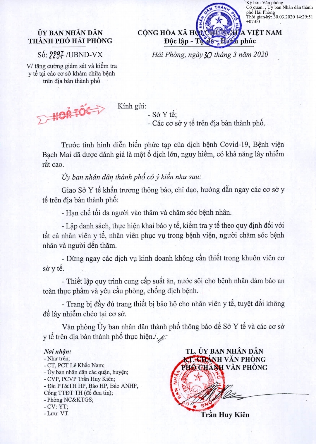UBND thành phố giao Sở Y tế khẩn trương thông báo, chỉ đạo, hướng dẫn ngay các cơ sở y tế trên địa bàn thành phố hạn chế tối đa người vào thăm và chăm sóc bệnh nhân. Lập danh sách, thực hiện khai báo y tế theo quy định đối với tất cả nhân viên y tế, nhân viên phục vụ trong bệnh viện, người chăm sóc bệnh nhân và người đến thăm. Dừng ngay các dịch vụ kinh doanh không cần thiết trong khuôn viên cơ sở y tế. Thiết lập quy trình cung cấp suất ăn, nước sôi cho bệnh nhân đảm bảo an toàn thực phẩm và yêu cầu phòng, chống dịch bệnh. Trang bị đầy đủ trang thiết bị bảo hộ cho nhân viên y tế, tuyệt đối không để lây nhiễm chéo tại cơ sở.