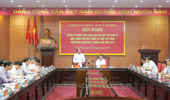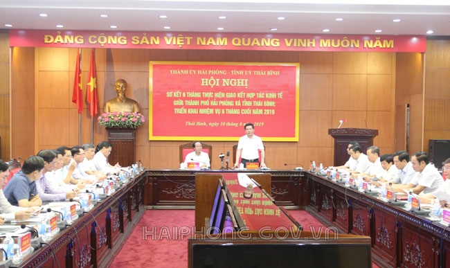 Phát biểu tại Hội nghị, đồng chí Bí thư Thành ủy Lê Văn Thành cảm ơn lãnh đạo tỉnh Thái Bình đã chuẩn bị chu đáo tổ chức Hội nghị sơ kết. Qua ý kiến, thảo luận của các đại biểu hai địa phương, đồng chí đánh giá, trong bối cảnh chung còn nhiều khó khăn, hai địa phương trong 6 tháng đầu năm 2019 đã đạt được nhiều kết quả về phát triển kinh tế – xã hội, an ninh – quốc phòng; đã triển khai được những nội dung hai địa phương đã ký giao kết hợp tác phát triển vào tháng 1/2019, với các công trình giao thông được triển khai tích cực, có bước đi thiết thực. Đồng chí Lê Văn Thành bày tỏ ấn tượng những kết quả Đảng bộ, chính quyền, quân và dân tỉnh Thái Bình đạt được trong thời gian qua về công tác thu ngân sách, thu hút đầu tư; đặc biệt, tỉnh đã xác định định hướng phát triển kinh tế hiện nay là phát triển về hướng biển theo Cảng quốc tế Lạch Huyện và sân bay Cát Bi, đây cũng là theo định hướng Nghị quyết 45 của Bộ Chính trị.