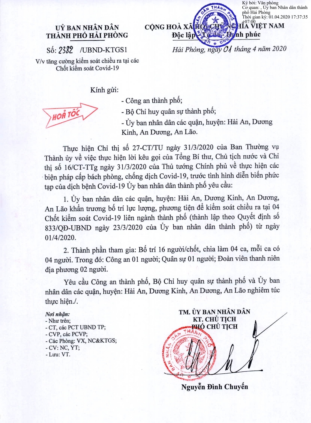 UBND các quận, huyện: Hải An, Dương Kinh, An Dương, An Lão khẩn trương bố trí lực lượng, phương tiện để kiểm soát chiều ra tại 4 Chốt kiểm soát COVID-19 liên ngành thành phố (thành lập theo Quyết định số 833/QĐ-UBND ngày 23/3/2020 của UBND thành phố) từ ngày 1/4/2020.