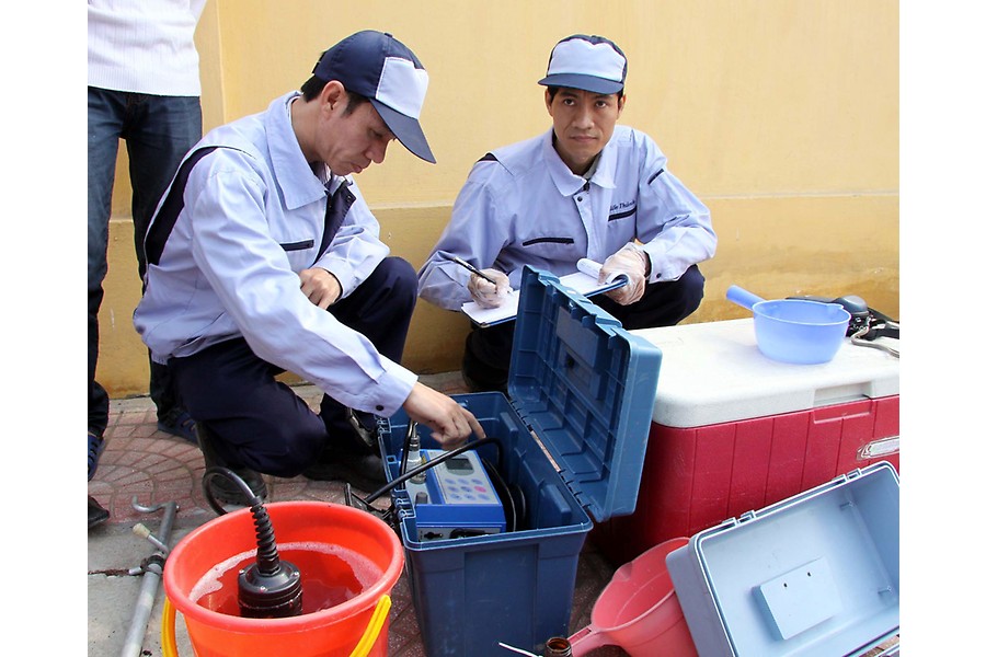 Cán bộ Trung tâm Quan trắc môi trường (Sở Tài nguyên- Môi trường) kiểm tra lấy mẫu xét nghiệm tại Nhà máy xử lý nước thải Khu công nghiệp Đồ Sơn.