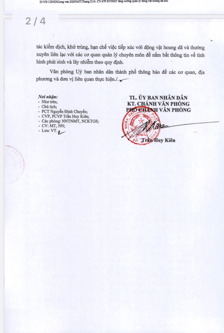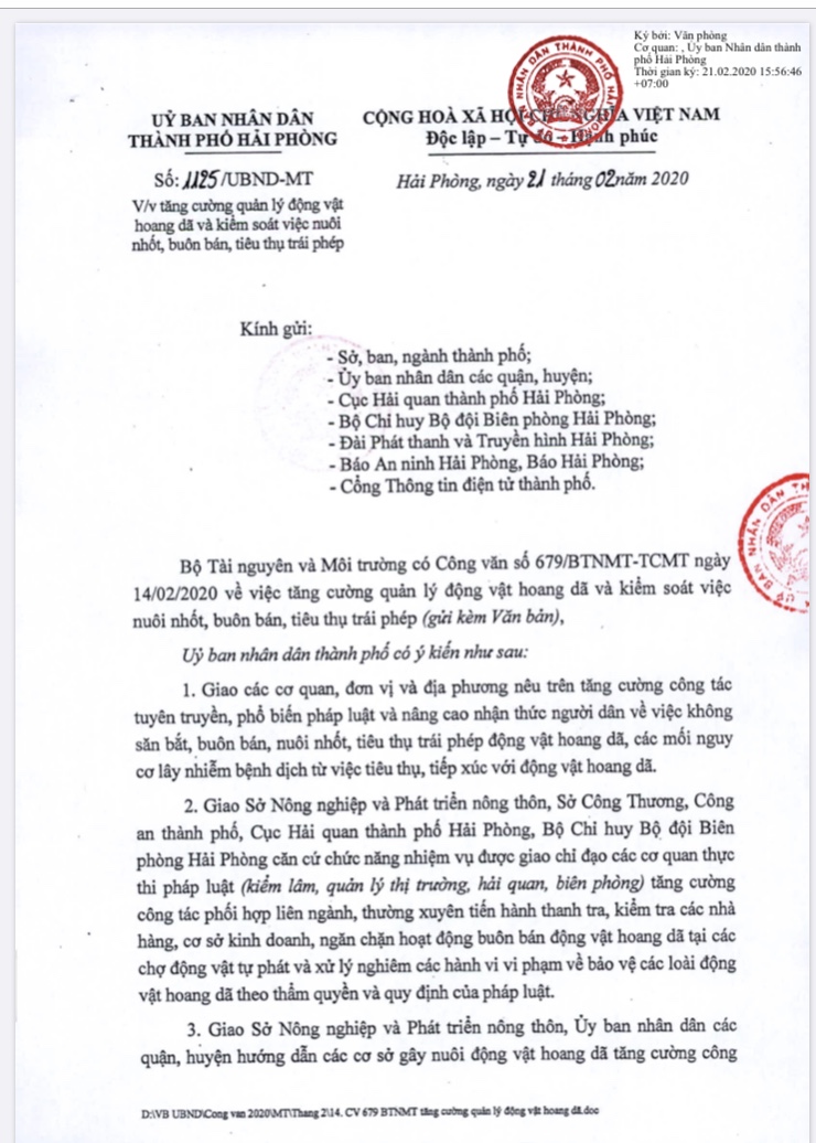 UNND thành phố Hải Phòng vừa ban hành văn bản số 1125/UBND-MT ngày 21/02/2020 về việc Tăng cường quản lý động vật hoang dã và kiểm soát việc nuôi nhốt, buôn bán, tiêu thụ trái phép
