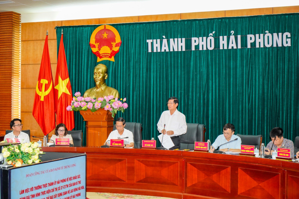 Qua nghe báo cáo và ý kiến của các thành viên Đoàn khảo sát, phát biểu tại cuộc làm việc, đồng chí Đỗ Ngọc An, Phó Trưởng Ban Kinh tế Trung ương đánh giá cao nỗ lực của thành phố Hải Phòng trong thực hiện Chỉ thị số 37-CT/TW, thành phố đã lãnh đạo, chỉ đạo triển khai thực hiện Chỉ thị số 37-CT/TW, đưa Chỉ thị số 37-CT/TW đi vào cuộc sống, đảm bảo môi trường lao động có quan hệ lao động hài hòa, ổn định và tiến bộ, góp phần giữ vững ổn định an ninh, kinh tế, chính trị của thành phố cũng như tạo động lực để phát triển kinh tế-xã hội bền vững; đã tăng cường công tác tập huấn, phổ biến kiến thức, quy định pháp luật liên quan tới hoạt động của doanh nghiệp về quyền, nghĩa vụ của người lao động, người sử dụng lao động trong các loại hình doanh nghiệp, tập trung vào những nội dung trọng tâm, liên quan mật thiết với người lao động.