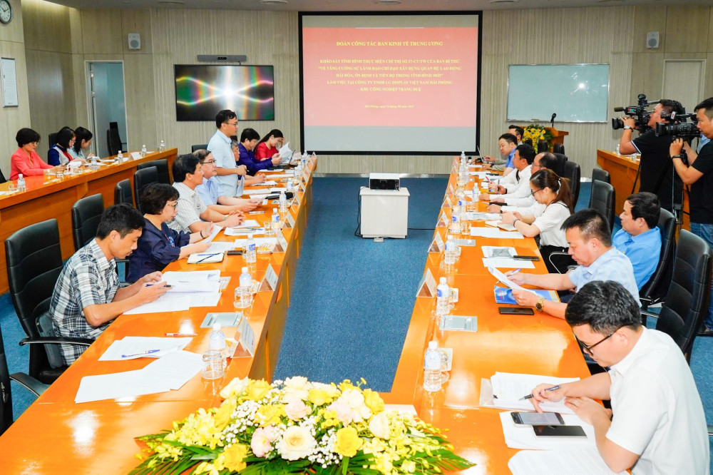 *** Trước đó, sáng 16/8, Đoàn khảo sát của Ban Kinh tế Trung ương khảo sát tình hình thực hiện Chỉ thị số 37-CT/TW, ngày 3/9/2019 của Ban Bí thư “về tăng cướng sự lãnh đạo, chỉ đạo xây dựng quan hệ lao động hài hòa, ổn định và tiến bộ trong tình hình mới” đã khảo sát làm việc tại Công ty TNHH Heesung Electronics Việt Nam và Công ty TNHH LG Display Việt Nam Hải Phòng tại KCN Tràng Duệ, huyện An Dương.