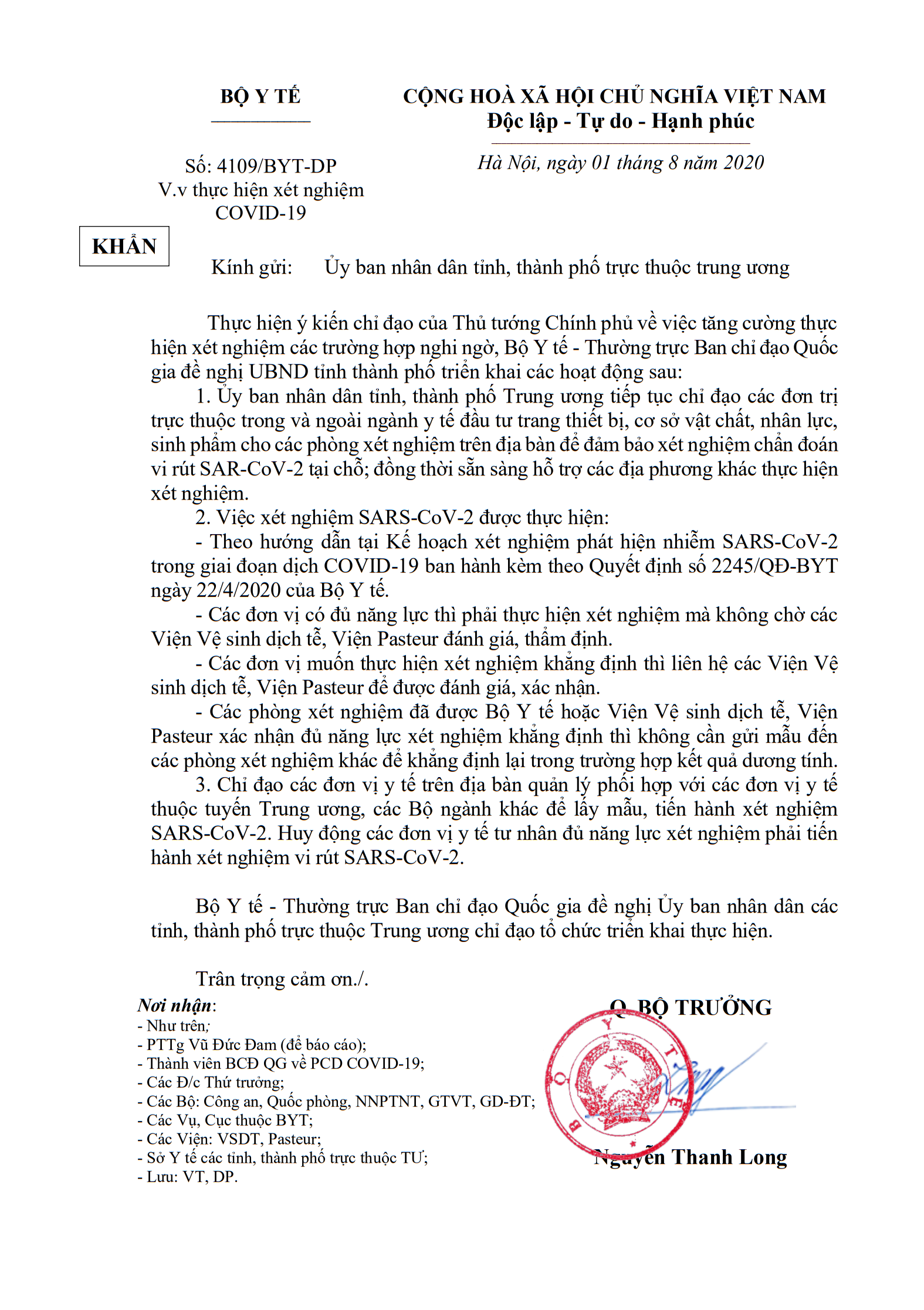 Thực hiện ý kiến chỉ đạo của Thủ tướng Chính phủ về việc tăng cường thực hiện xét nghiệm các trường hợp nghi ngờ, Bộ Y tế – Thường trực Ban chỉ đạo Quốc gia đề nghị UBND tỉnh thành phố triển khai các hoạt động sau: