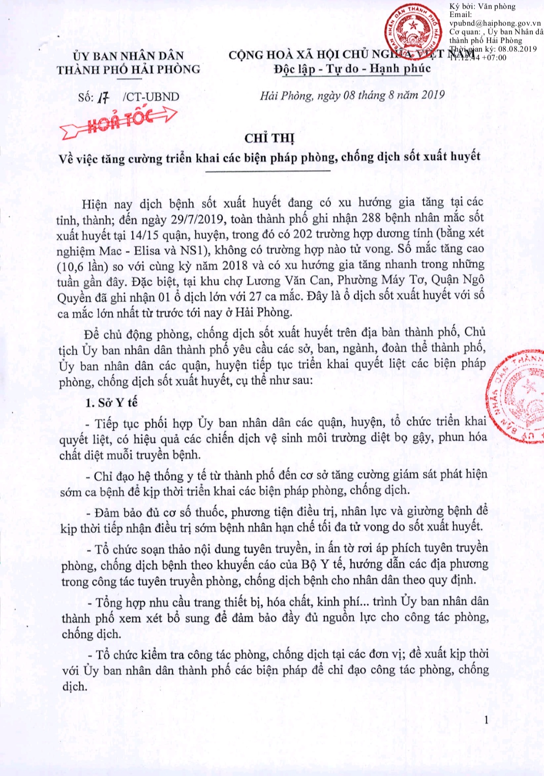 Trước tình hình trên, UBND thành phố vừa ban hành Chỉ thị số 17/CT-UBND ngày 8/8/2019 về việc tăng cường triển khai các biện pháp phòng, chống dịch sốt xuất huyết.