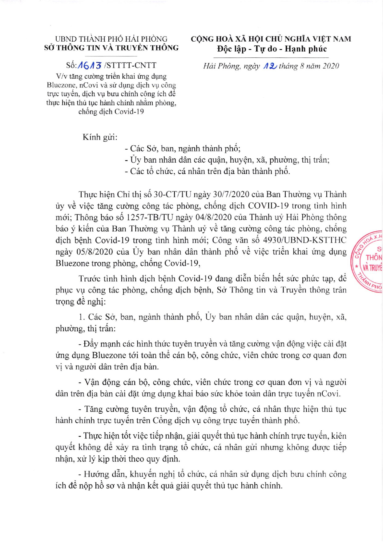Thực hiện Chỉ thị số 30-CT/TU ngày 30/7/2020 của Ban Thường vụ Thành ủy về việc tăng cường công tác phòng, chống dịch COVID-19 trong tình hình mới; Thông báo số 1257-TB/TU ngày 04/8/2020 của Thành ủy Hải Phòng thông báo ý kiến của Ban Thường vụ Thành ủy về tăng cường công tác phòng, chống dịch bệnh Covid-19 trong tình hình mới; Công văn số 4930/UBND-KSTTHC ngày 05/8/2020 của Ủy ban nhân dân thành phố về việc triển khai ứng dụng Bluezone trong phòng, chống Covid-19, Sở Thông tin và Truyền thông vừa ban hành công văn số 1613/STTTT-CNTT về việc tăng cường triển khai ứng dụng Bluezone, nCovi và sử dụng dịch vụ công trực tuyến, dịch vụ bưu chính công ích để thực hiện thủ tục hành chính nhằm phòng, chống dịch Covid-19.