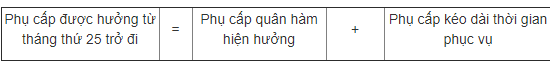 Trong đó: Phụ cấp kéo dài thời gian phục vụ = Phụ cấp quân hàm hiện hưởng x 250%