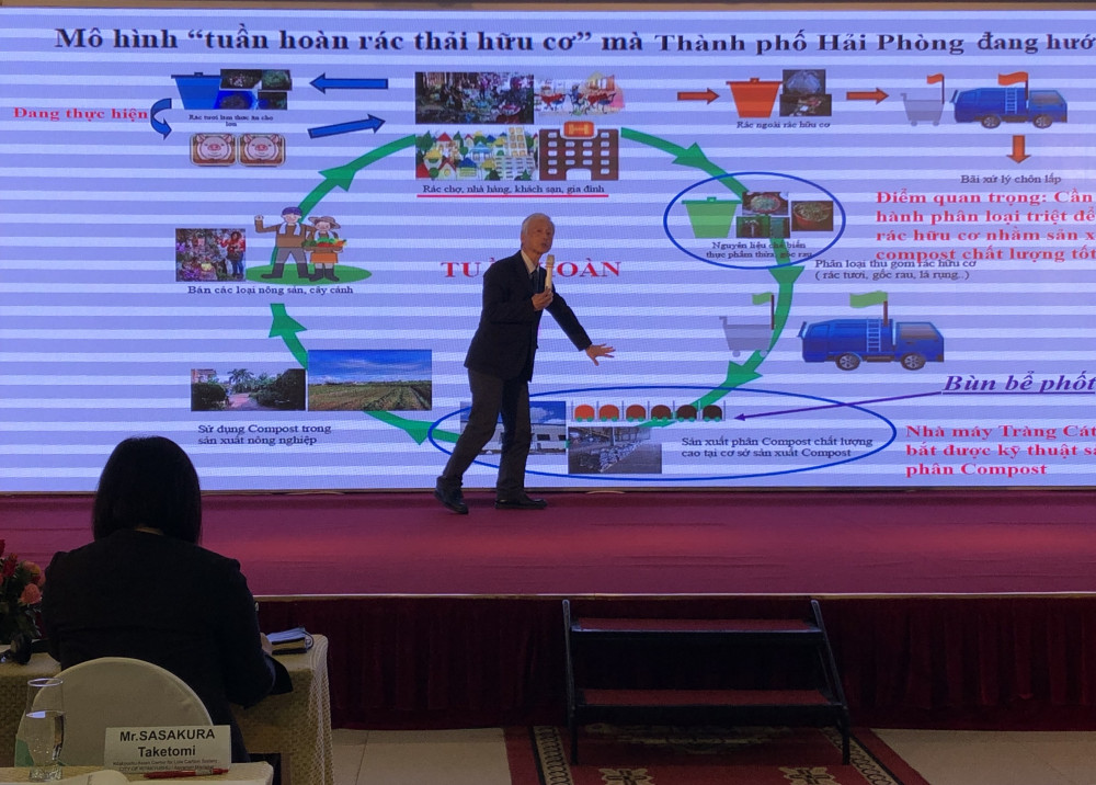 Tiến sỹ Koji Tatakura-chuyên gia phân bón thành phố Kytakyushu: Hiện thực hoá kế hoạch thúc đẩy tăng trưởng xanh đã được Bộ Môi trường Nhật Bản, thành phố Kytakyushu ký kết với thành phố cảng Hải Phòng, từ năm 2015, chúng tôi đã bắt đầu hợp tác kỹ thuật sản xuất phân hữu cơ (compost) thí điểm tại hai quận Ngô Quyền, Hải An. Với khẩu hiệu “Chúng ta chung tay biến rác thành tài nguyên”, chúng tôi đã giới thiệu, tập huấn tới các hộ gia đình kỹ thuật phân loại rác, rồi đề nghị hợp tác tại các đơn vị phát thải số lượng rác lớn như chợ, nhà hàng, khách sạn.