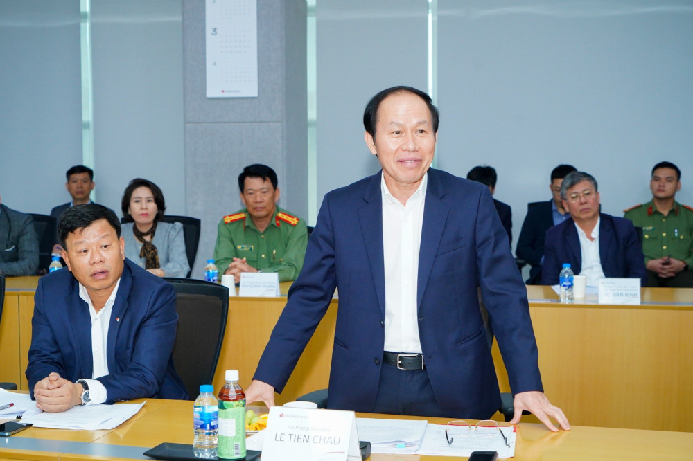 Đồng chí Lê Tiến Châu, Bí thư Thành ủy cảm ơn Tập đoàn LG đã chọn Hải Phòng để đầu tư và cùng phát triển; đồng thời đánh giá cao chiến lược kinh doanh; quy mô; tốc độ triển khai các dự án; công nghệ, trình độ quản trị, môi trường làm việc của các doanh nghiệp thuộc Tập đoàn LG. Đồng chí ghi nhận sự đóng góp của các doanh nghiệp đối với sự phát triển của thành phố Hải Phòng; luôn có ý thức chấp hành nghiêm pháp luật Việt Nam, đóng góp đồng hành xử lý các vấn đề về môi trường, rác thải, chất thải, bảo đảm an sinh xã hội…
