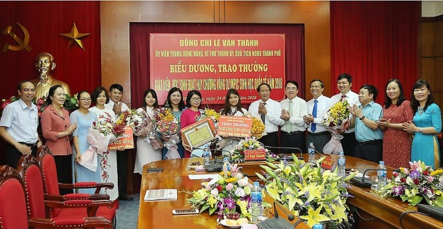 Đồng chí Lê Văn Thành, Ủy viên Trung ương Đảng, Bí thư Thành ủy, Chủ tịch HĐND thành phố cùng các đồng chí lãnh đạo thành phố trao bằng khen và phần thưởng tặng học sinh đoạt HCV Olympic sinh học quốc tế năm 2018 và giáo viên. Ảnh: Duy Thính