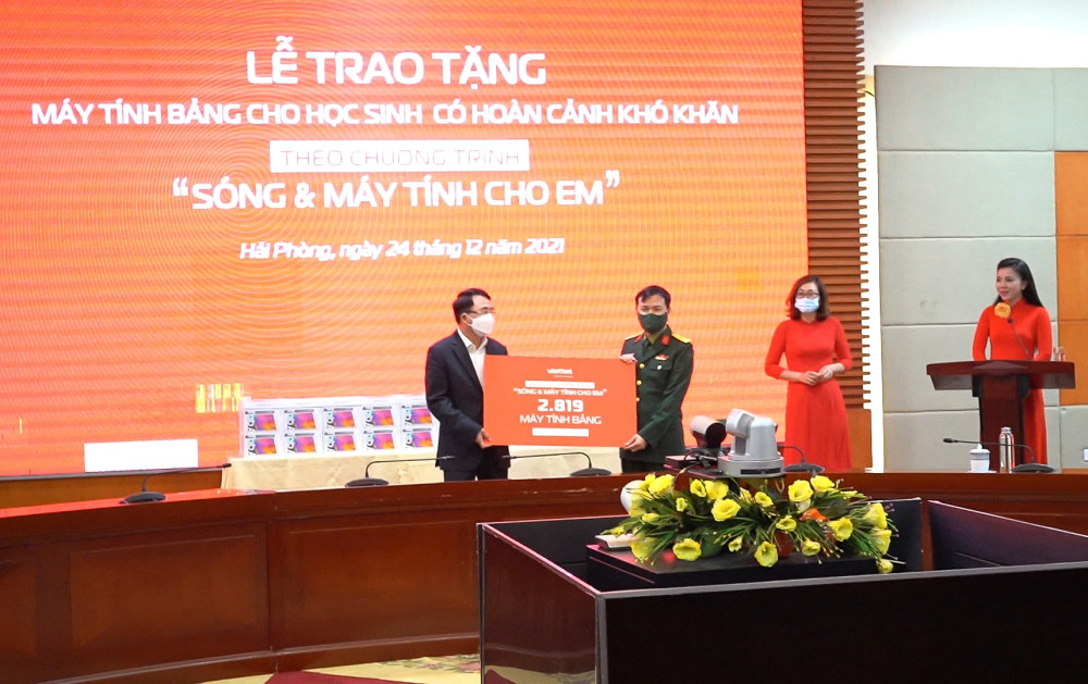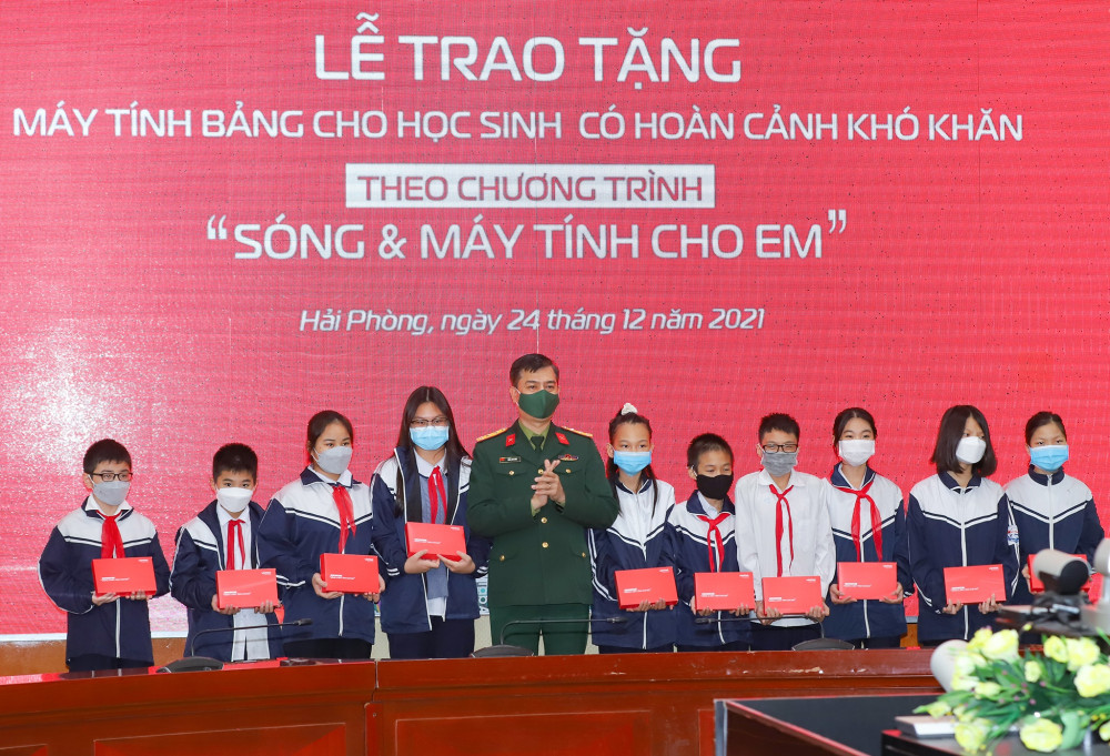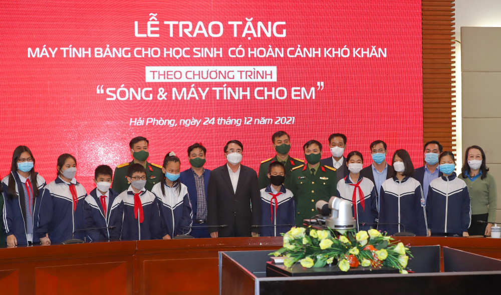 Trước diễn biến phức tạp của dịch Covid-19, có nhiều giai đoạn các em học sinh trên địa bàn thành phố chưa thể đến trường để học trực tiếp, học sinh cấp THCS và THPT phải học trực tuyến. Vì vậy, với trách nhiệm là đơn vị công nghệ chủ lực của đất nước, Viettel là doanh nghiệp có đóng góp lớn nhất vào các hoạt động phòng, chống Covid-19 và luôn đồng hành cùng ngành GD&ĐT thúc đẩy chuyển đổi số. Trong chương trình “Sóng và Máy tính cho em” do Thủ tướng Chính phủ phát động, Tập đoàn Viettel tham gia hỗ trợ 37.000 máy tính cho các em học sinh có hoàn cảnh khó khăn trên toàn quốc. Riêng tại Hải Phòng trong đợt này, Tập đoàn Viettel trao tặng 2.819 máy tính bảng để giúp cho các em học sinh, sinh viên có hoàn cảnh khó khăn có đủ trang thiết bị học tập trực tuyến.