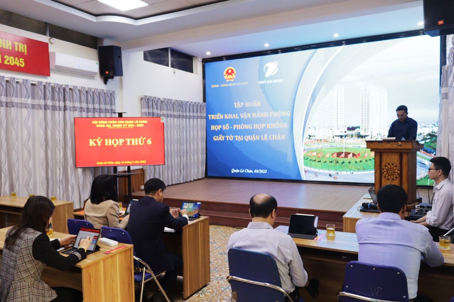 Thực hiện Nghị quyết số 03-NQ/TU của Ban Thường vụ Thành ủy về Chuyển đổi số thành phố Hải Phòng đến năm 2025, định hướng đến năm 2030; Nghị quyết số 91/NQ-HĐND ngày 15/7/2022 của HĐND quận về Quyết định chủ trương đầu tư dự án Phòng họp không giấy tờ, xây dựng họp số, phòng họp không giấy tờ tại quận Lê Chân, ứng dụng mở rộng cho các phiên họp Quận ủy-UBND quận.