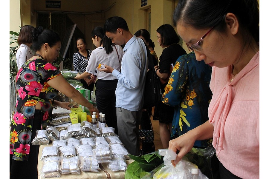 Các đại biểu tìm hiểu sản phẩm từ cây thuốc nam được giới thiệu tại hội nghị.