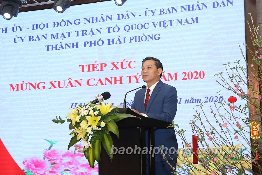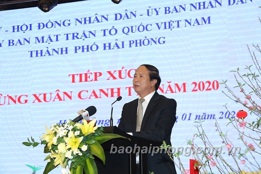 Đồng chí Lê Văn Thành, Bí thư Thành ủy phát biểu nhấn mạnh ý nghĩa của cuộc gặp gỡ, tiếp xúc ấm áp trong thời điểm chuẩn bị đón mùa xuân mới Canh Tý. Theo đồng chí Bí thư Thành ủy, năm 2019, thành phố đạt kết quả rất tốt đẹp, toàn diện, làm nổi bật thêm thành tích trong 4 năm đưa Nghị quyết đại hội Đảng bộ thành phố lần thứ 15 vào cuộc sống; đời sống vật chất, tinh thần của người dân không ngừng được nâng cao; không khí vui tươi, phấn khởi, tin tưởng vào sự lãnh đạo của Thành ủy, HĐND, UBND thành phố ngày càng lan tỏa rộng rãi trong các tầng lớp nhân dân. Đồng chí Bí thư Thành ủy nhấn mạnh, kết quả đó là sự nỗ lực, cố gắng của cả hệ thống chính trị thành phố với nhiều cách làm đổi mới, sáng tạo, hiệu quả cao; là sự kế thừa thành công thành tựu của hơn 30 năm thực hiện công cuộc đổi mới; đặc biệt là sự ủng hộ, giúp đỡ chí tình của Trung ương. Đồng chí Bí thư Thành ủy nhấn mạnh, trong nhiệm kỳ này, Hải Phòng vinh dự được đón hầu hết các đồng chí Ủy viên Bộ Chính trị về thăm và làm việc; Bộ Chính trị ban hành Nghi quyết 45 về sự phát triển của Hải Phòng tới năm 2045; tạo mọi điều kiện thuận lợi, nhất là về các cơ chế chính sách, tạo đà để thành phố bứt phá mạnh mẽ. Đây là cơ hội, là thời cơ để Hải Phòng phát triển bùng nổ trong những năm tới.