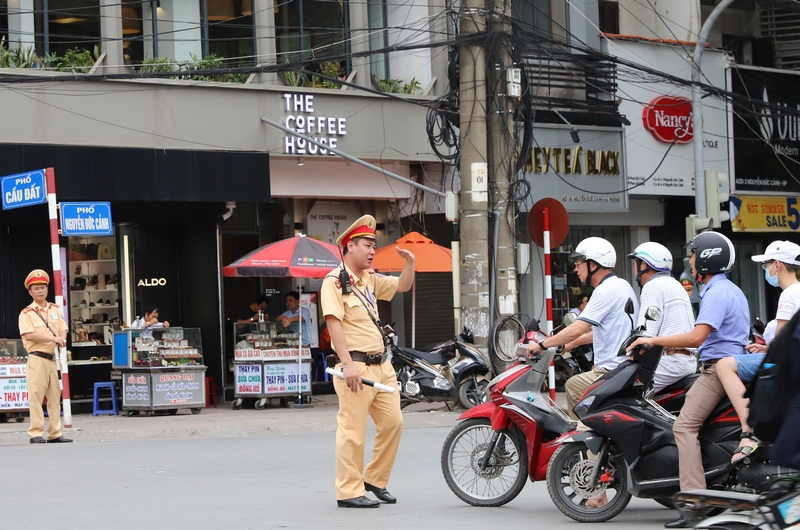 Lực lượng cảnh sát giao thông, thanh tra giao thông và cảnh sát trật tự hướng dẫn giao thông trong ngày đầu tiên thực hiện phân luồng, đảo chiều phố Cầu Đất và các tuyến phố lân cận