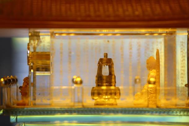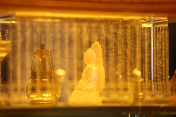 Ngọc Xá lợi Phật được cất giữ trong tháp đồng nhỏ, đặt trang trọng trong tháp pha lê lưu ly 7 tầng, tỏa sáng lung linh giữa không gian trang nghiêm mà lộng lẫy trong lòng Đại Tượng Phật A Di Đà ở độ cao 3000m.