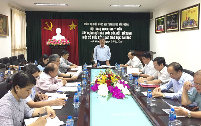 Để chuẩn bị cho kỳ họp thứ Sáu, Quốc hội khóa XIV, chiều 25/9, Đoàn ĐBQH thành phố Hải Phòng tổ chức Hội nghị tham gia ý kiến xây dựng dự thảo Luật sửa đổi, bổ sung một số điều của Luật Giáo dục đại học. Đồng chí Đỗ Văn Bình, Phó Giám đốc Sở Lao động, Thương binh và Xã hội, đại biểu Quốc hội thành phố Hải Phòng chủ trì Hội nghị. Dự hội nghị có đại diện lãnh đạo các đơn vị liên quan.