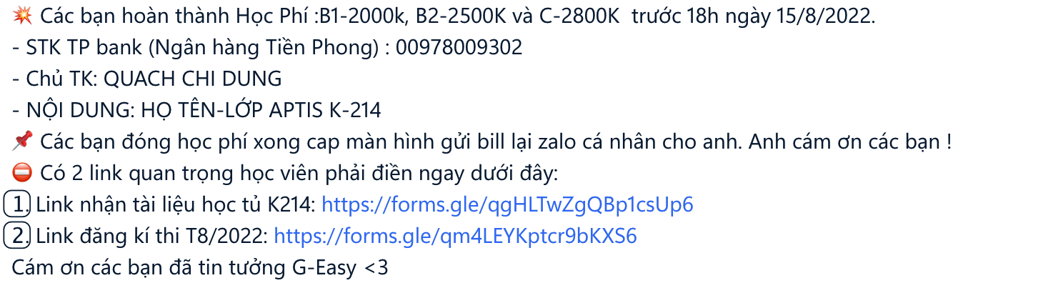 Trong vai thí sinh có nhu cầu học, thi chứng chỉ Aptis mức B1, chúng tôi liên hệ với Trung tâm APTIS G-EASY để đăng ký học, thi. Một người có tên Quách Chí Dũng, tự nhận là người của trung tâm, đã cho chúng tôi vào 1 nhóm Zalo kín và hướng dẫn cách đóng tiền học, lệ phí thi. Mức giá Dũng đưa ra dao động từ 4-4,8 triệu đồng, tuỳ vào mức độ chứng chỉ người học đăng ký.
