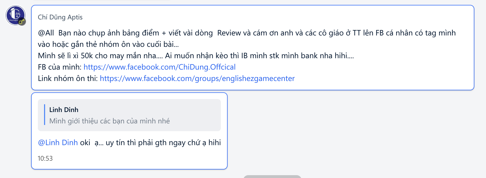 Dù hoạt động chui, nhưng những chiêu trò quảng cáo của trung tâm này lại hết sức tinh vi. Học viên đăng bài review về khoá học sẽ được nhận ngay 50.000 đồng.