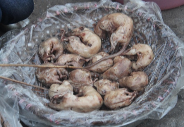 Trước mắt tôi gần hai chục con chuột đã luộc sẵn bày ra ngồn ngộn, vì đã gặp vài lần nên tôi không còn cảm giác rờn rợn trước những bộ răng nhe ra trắng ởn nữa. Loạt chuột này khá đều, mỗi con chỉ nặng khoảng lạng rưỡi, là loại được cho là ngon nhất, chắc là Linh cũng có nhã ý để phần khách.