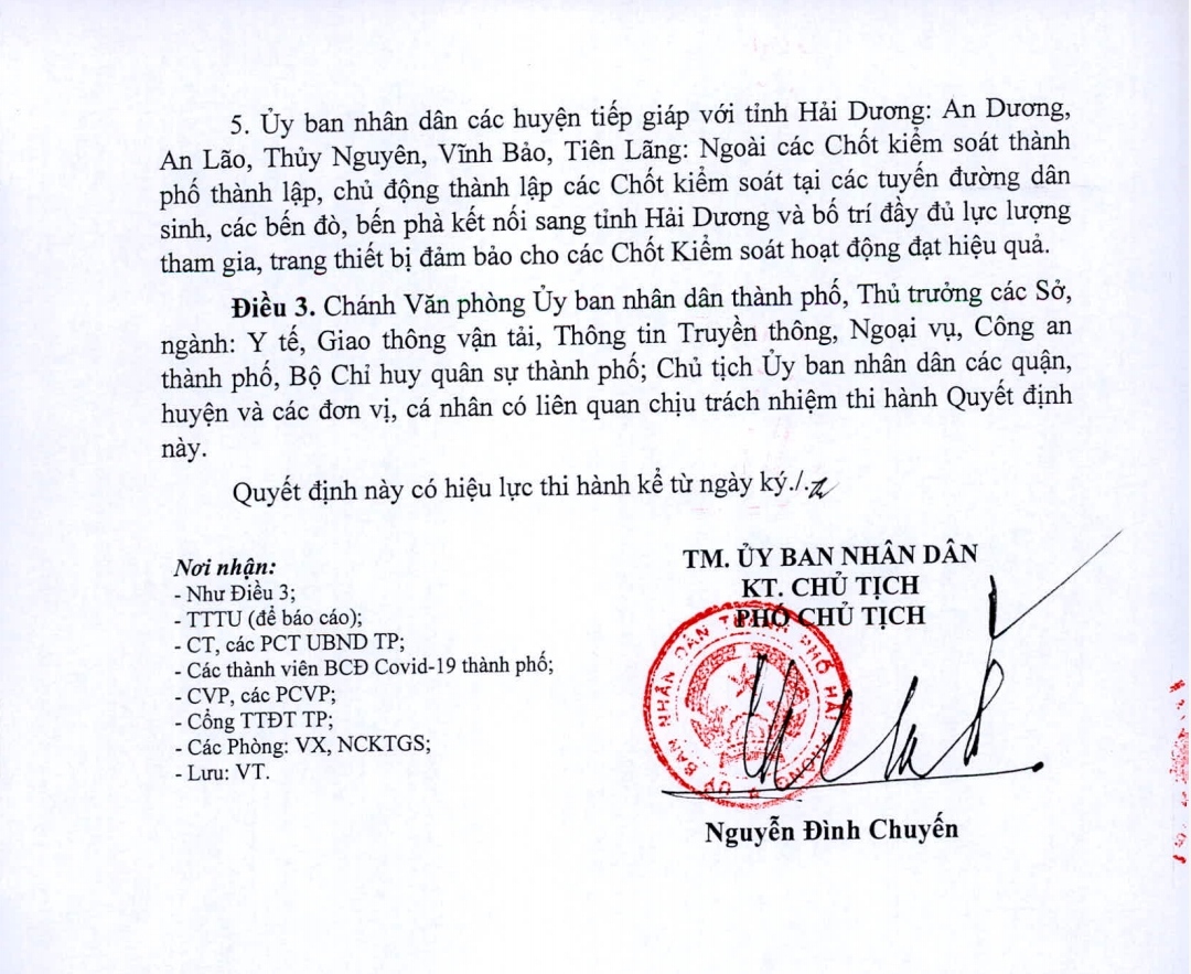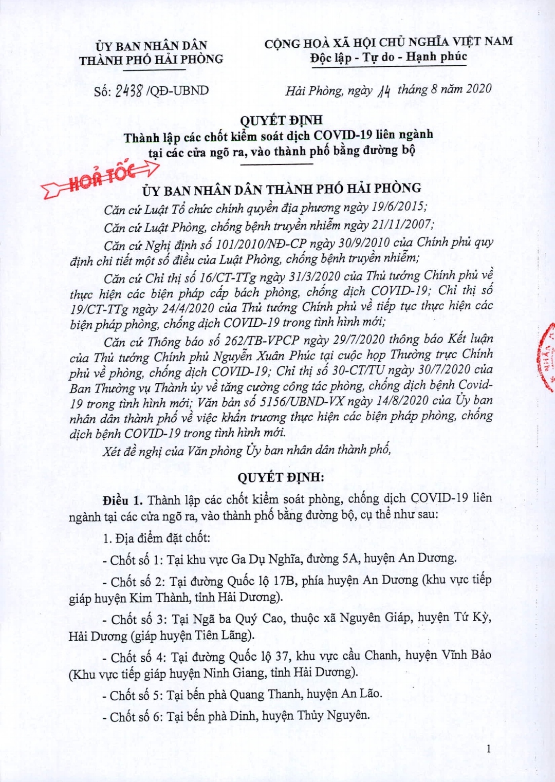 Ngày 14/8/2020, Ủy ban nhân dân thành phố đã có Quyết định số 2438/QĐ-UBND thành lập các chốt kiểm soát dịch COVID-19 liên ngành tại các cửa ngõ ra, vào thành phố bằng đường bộ.