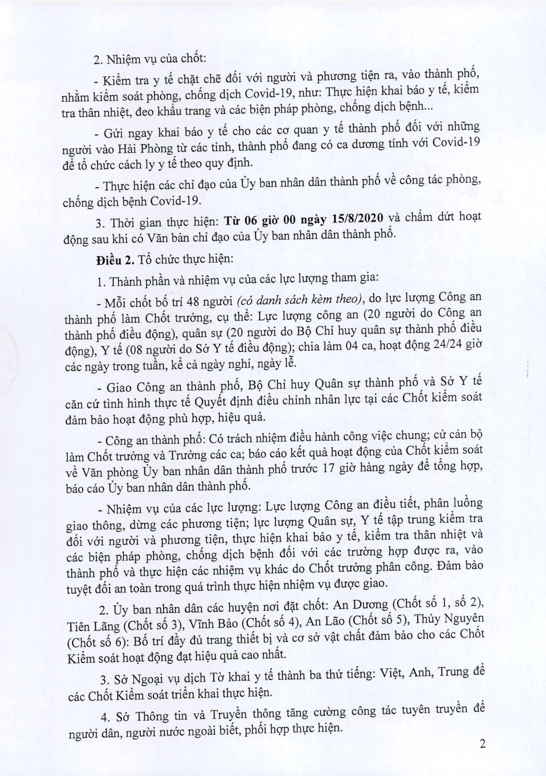 Theo đó, thành lập 06 chốt kiểm soát phòng, chống dịch COVID-19 liên ngành tại các cửa ngõ ra, vào thành phố từ 06 giờ 00 phút ngày 15/8/2020 và chấm dứt hoạt động sau khi có Văn bản chỉ đạo của UBDN thành phố.