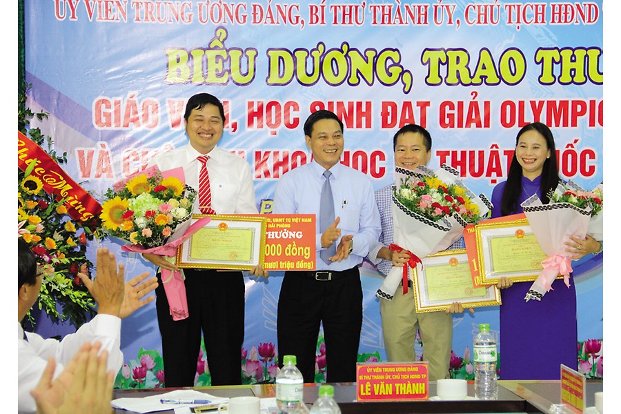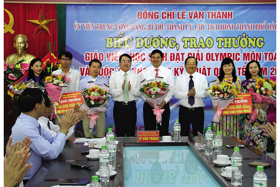 Đồng chí Lê Văn Thành, Ủy viên Trung ương Đảng, Bí thư Thành ủy, Chủ tịch HĐND thành phố trao thưởng tặng các giáo viên và học sinh đoạt giải Olimpic Toán và khoa học kỹ thuật.