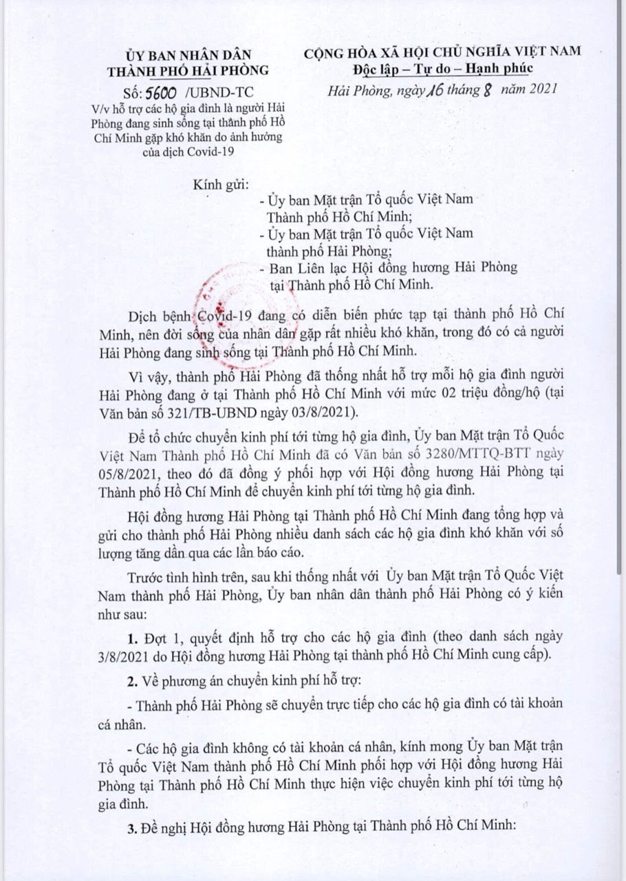 Theo Văn bản số 5600/UBND-TC của UBND thành phố Hải Phòng về việc hỗ trợ các hộ gia đình là người Hải Phòng đang sinh sống tại thành phố Hồ Chí Minh gặp khó khăn do ảnh hưởng của dịch COVID-19, thành phố Hải Phòng thống nhất hỗ trợ mỗi hộ gia đình người Hải Phòng đang ở tại thành phố Hồ Chí Minh với mức 2 triệu đồng/hộ.