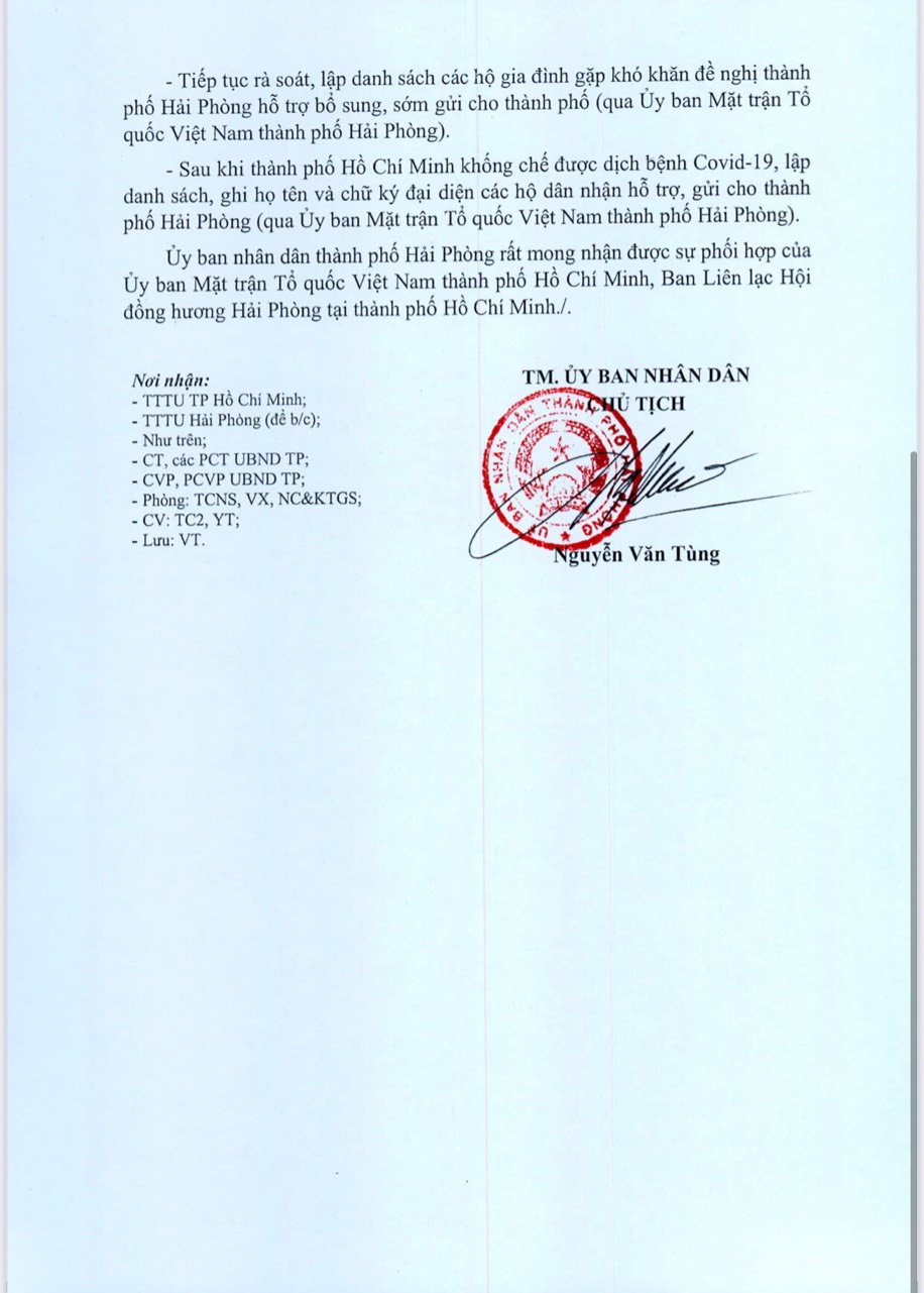 Hội đồng hương Hải Phòng tại thành phố Hồ Chí Minh tiếp tục rà soát, lập danh sách các hộ gia đình gặp khó khăn đề nghị thành phố Hải Phòng hỗ trợ bổ sung. Danh sách gửi qua Ủy ban MTTQ Việt Nam thành phố Hải Phòng.