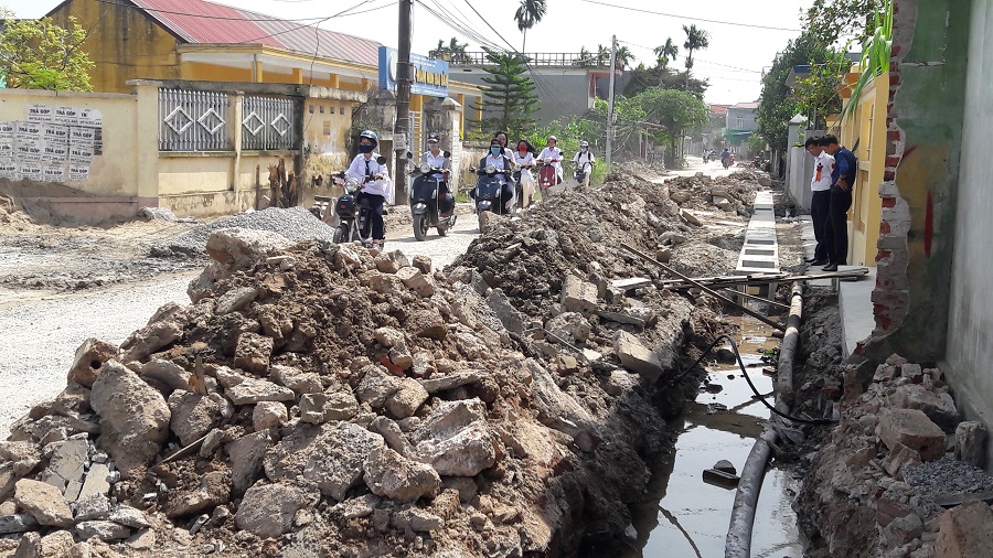 Hiện nhà thầu đang thi công hệ thống rãnh thoát nước nhưng phần đất đá đào vét nên trong quá trình thi công chậm được thu gom vận chuyển nên ảnh hưởng đến việc đi lại của nhân dân địa phương.