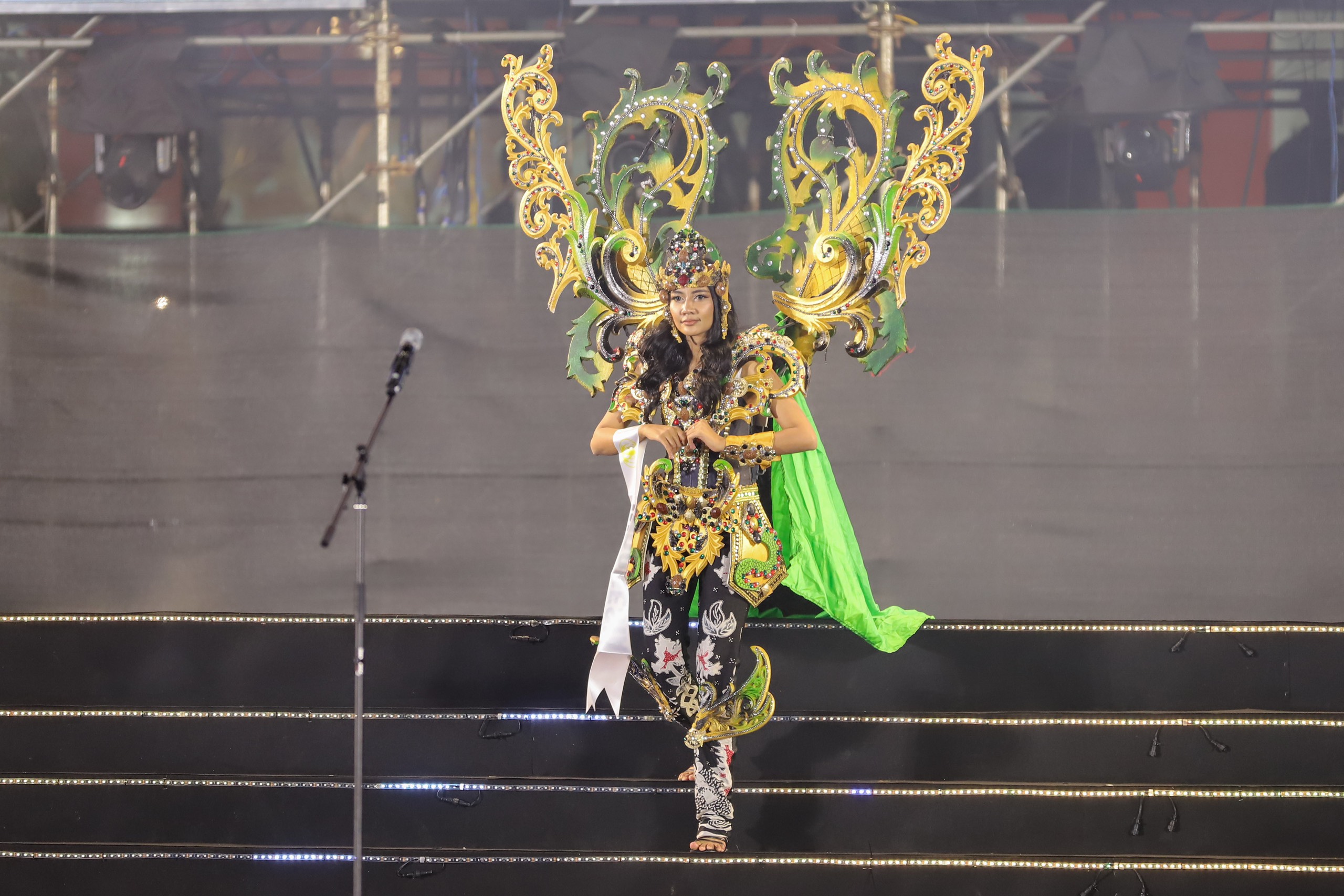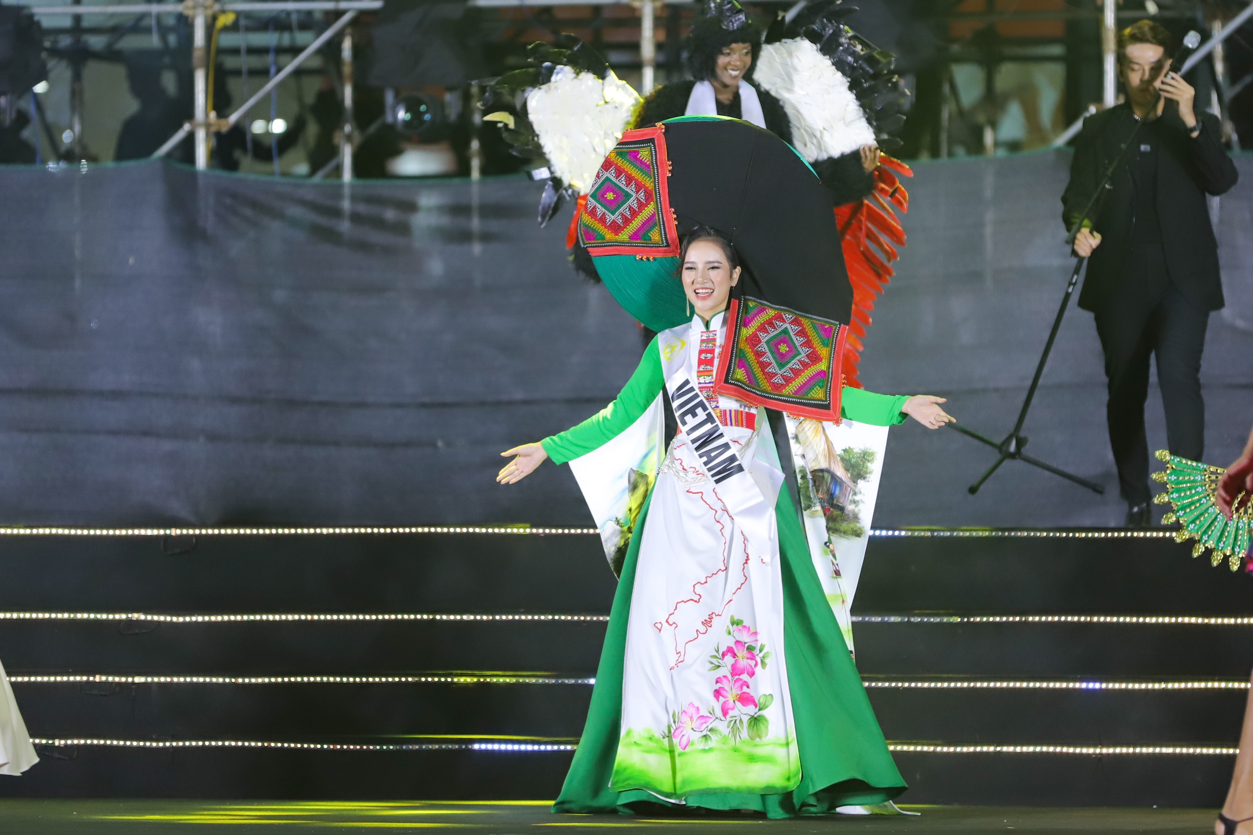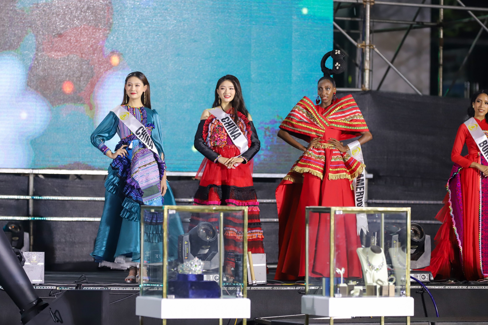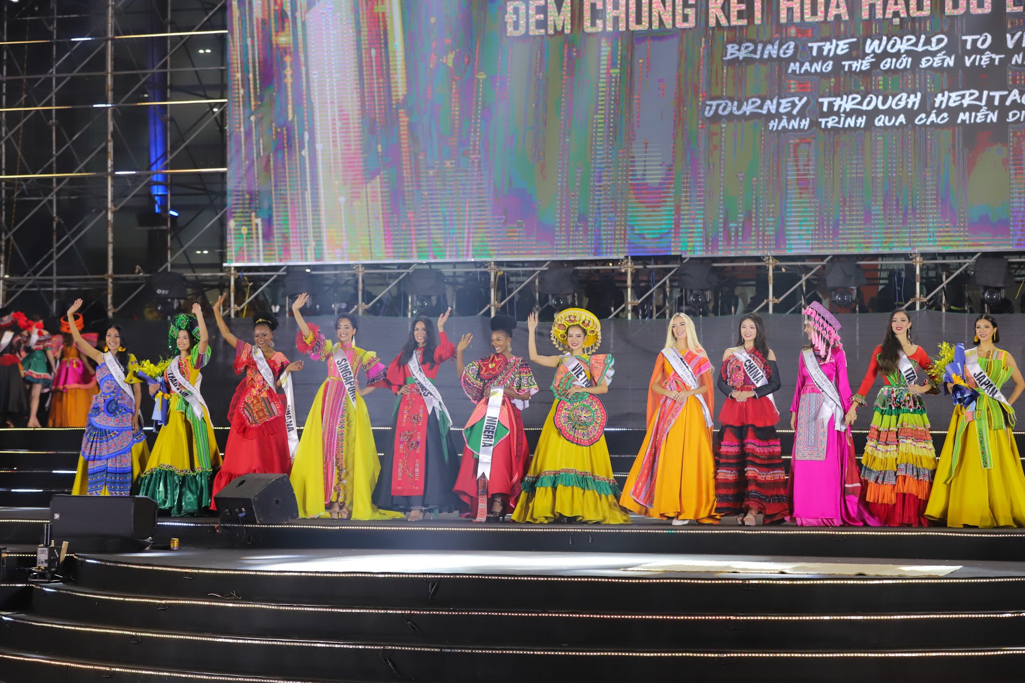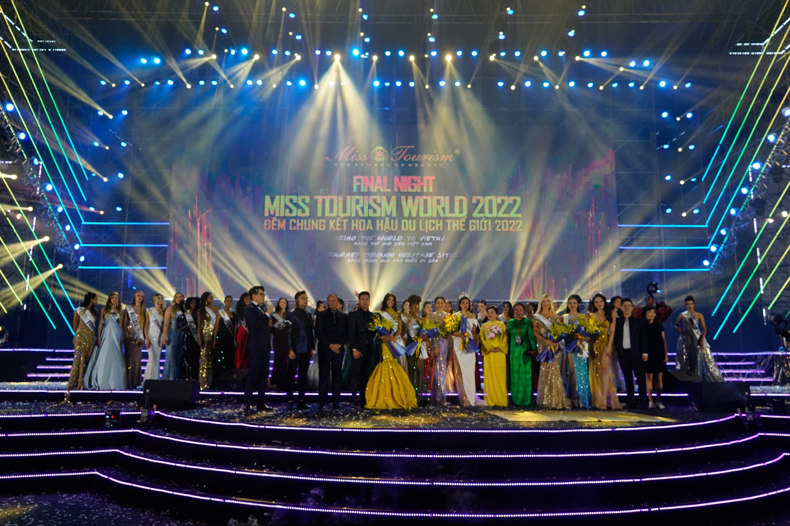 Đêm chung kết Miss Tourism World 2022 diễn ra trong không gian đậm đà bản sắc văn hoá dân tộc Việt Nam với các tiết mục múa xòe Thái, trống quân, múa sợi cói, đèn lồng… Thêm đó là sự xuất hiện của các thí sinh duyên dáng trong tà áo dài lụa tơ tằm và những bộ váy thổ cẩm, những chất liệu quen thuộc của Việt Nam.
