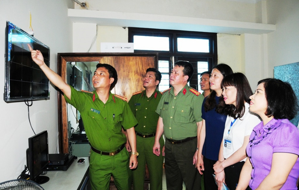 Đại tá Nguyễn Quốc Hùng, Phó Giám đốc CATP cùng đại diện lãnh đạo huyện Kiến Thụy đi kiểm tra thực tế tại phòng điều hành hệ thống giám sát Camera.