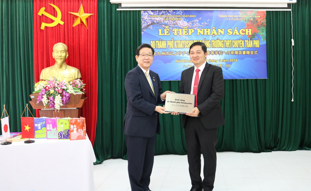 Hiệu trưởng Trường THPT chuyên Trần Phú đón nhận sách tặng từ Thị trưởng thành phố Kitakyushu