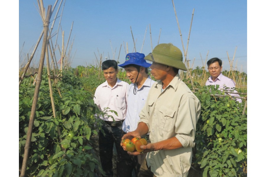 Các kỹ sư nông nghiệp hướng dẫn nông dân kỹ thuật sản xuất cà chua năng suất, chất lượng cao.