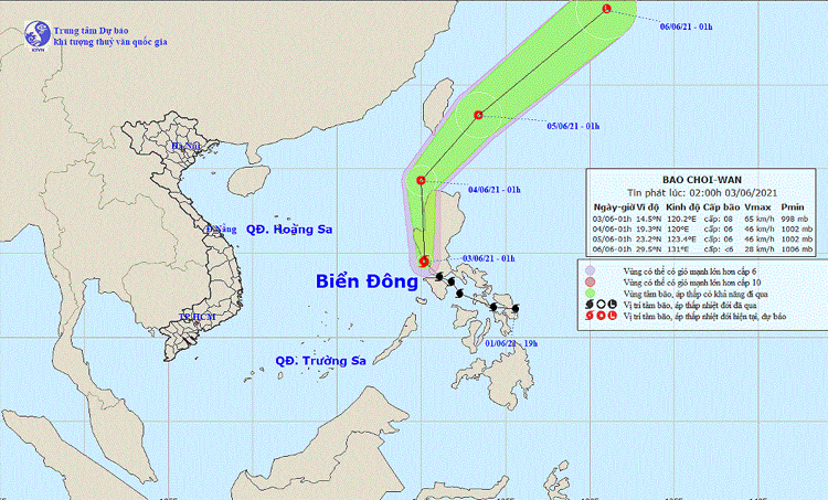 Hiện khu vực miền Trung Philippines đang có một cơn bão hoạt động (có tên quốc tế là Choi-wan). Vào lúc 1 giờ ngày 3/6, vị trí tâm bão ở vào khoảng 14,5 độ Vĩ Bắc; 120,2 độ Kinh Đông, trên khu vực phía Tây Nam đảo Lu-dông (Philippines). Sức gió mạnh nhất vùng gần tâm bão mạnh cấp 8 (60-75km/giờ), giật cấp 10.