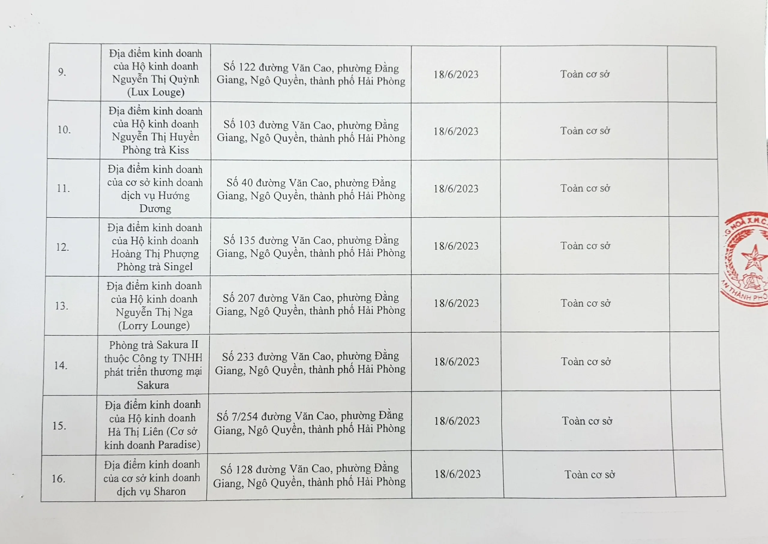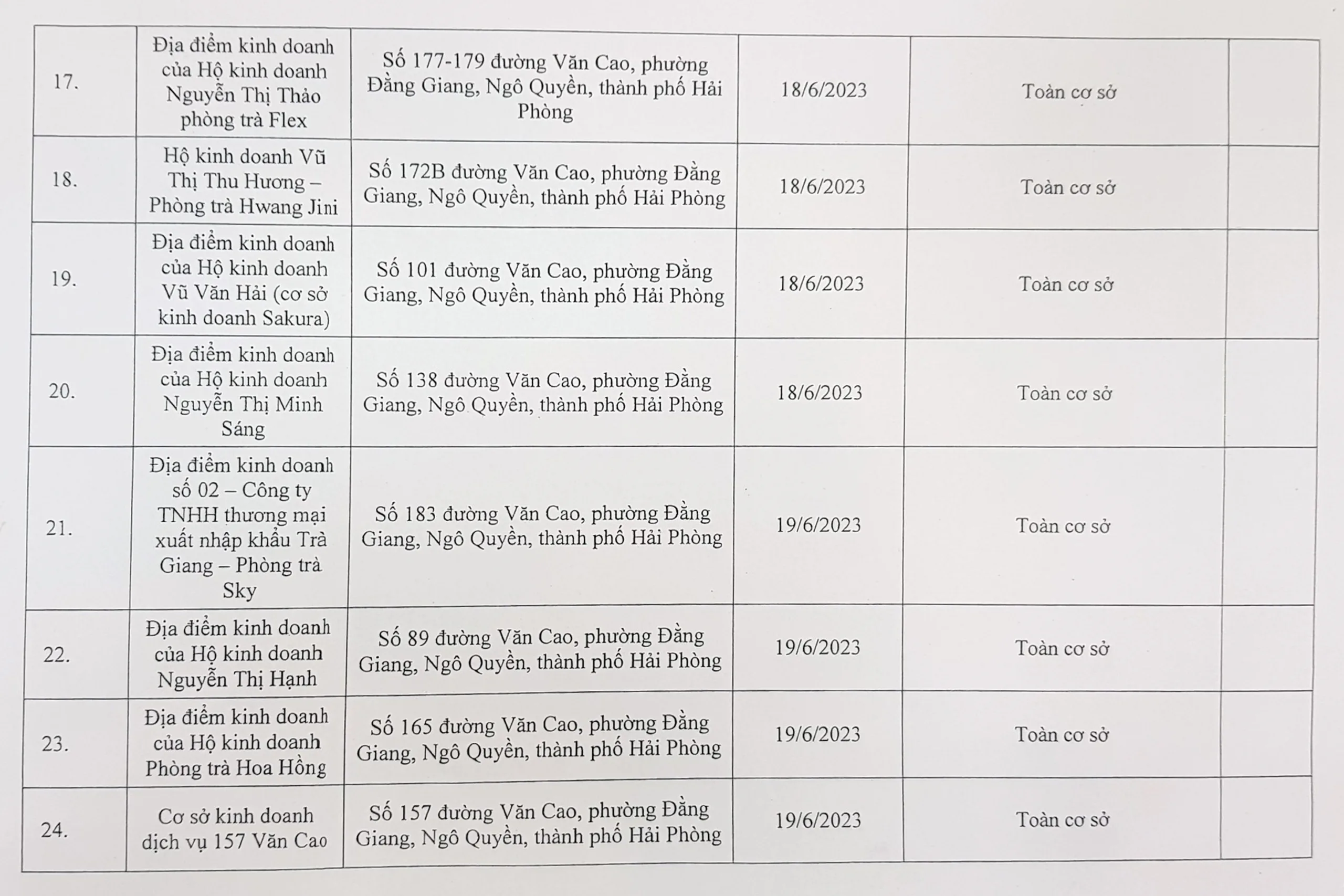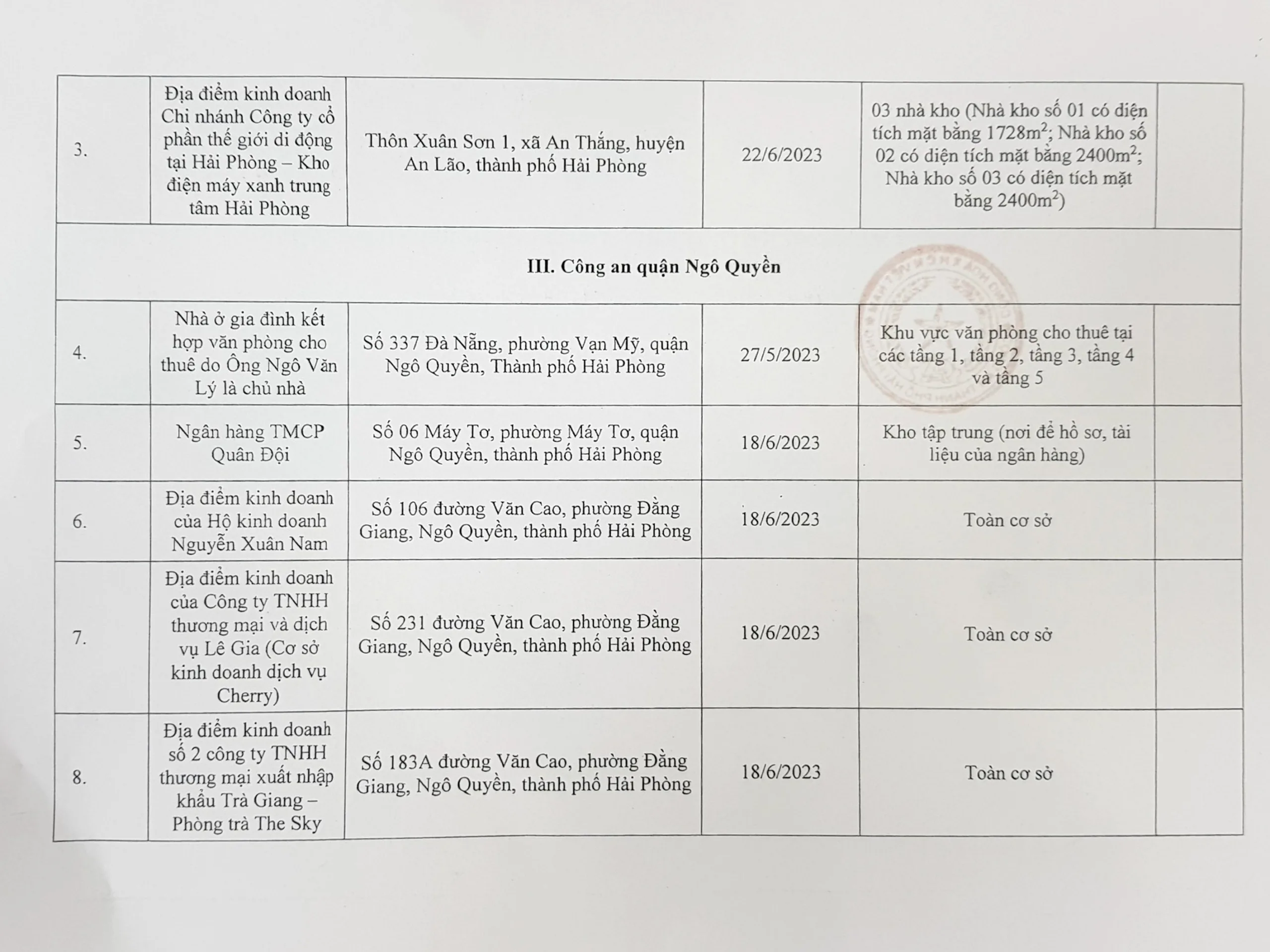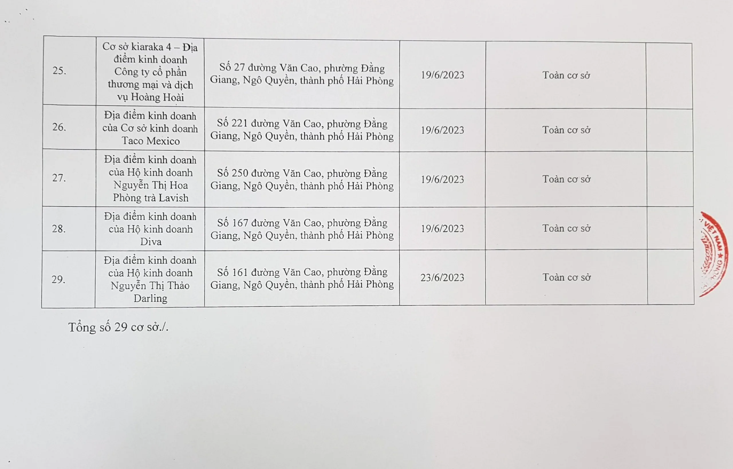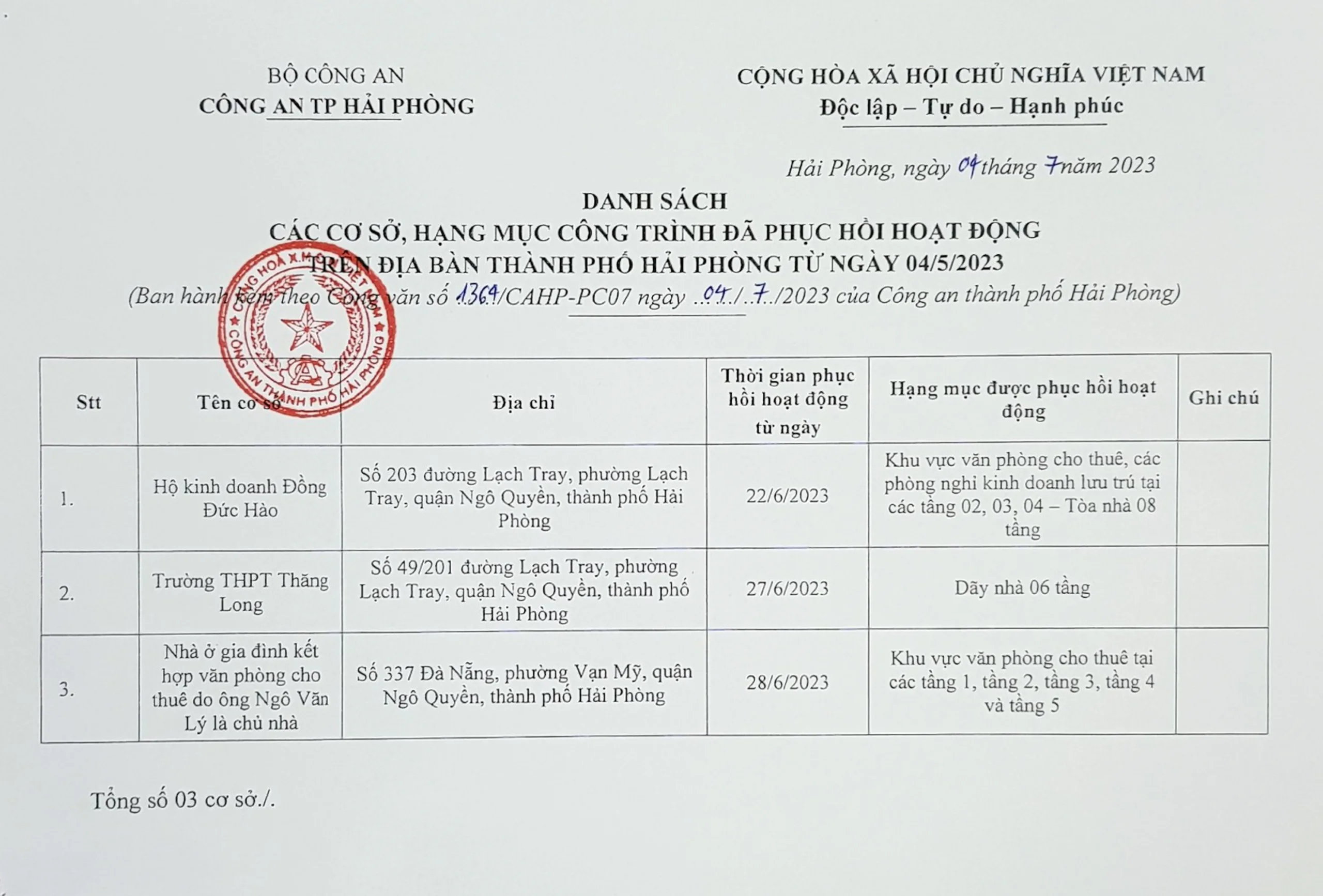 Qua công tác kiểm tra, rà soát Công an thành phố thông báo Danh sách 29 cơ sở trên địa bàn thành phố không đảm bảo an toàn phòng cháy chữa cháy, vi phạm nghiêm trọng quy định về phòng cháy chữa cháy đã bị đình chỉ hoạt động theo quy định, từ ngày 04/5/2023; và 03 cơ sở được phục hồi hoạt động trên địa bàn thành phố Hải Phòng từ ngày 4/5/2023 (Danh sách kèm theo).