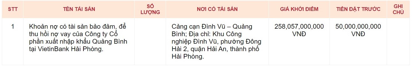 Trung tâm Dịch vụ đấu giá tài sản (thuộc Sở Tư pháp TP. Hải Phòng) tổ chức đấu giá khoản nợ có tài sản bảo đảm, để thu hồi nợ vay của Công ty Cổ phần xuất nhập khẩu Quảng Bình tại VietinBank Hải Phòng; Giá khởi điểm: 258.057.000.000 đồng. Tiền đặt trước: 50.000.000.000 đồng.