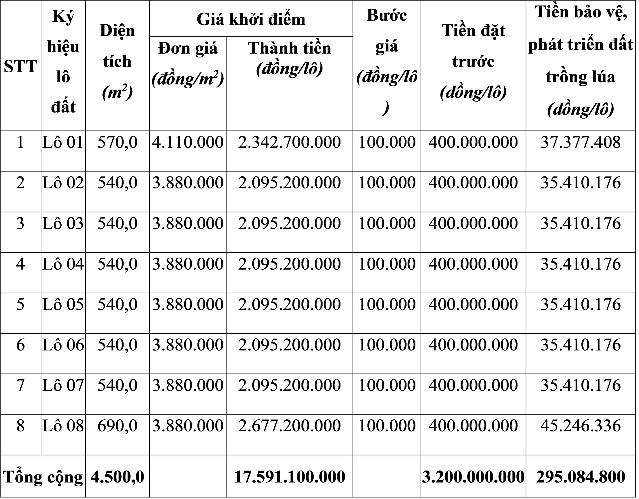 3. Tiền mua hồ sơ đấu giá: 500.000 đồng/hồ sơ.