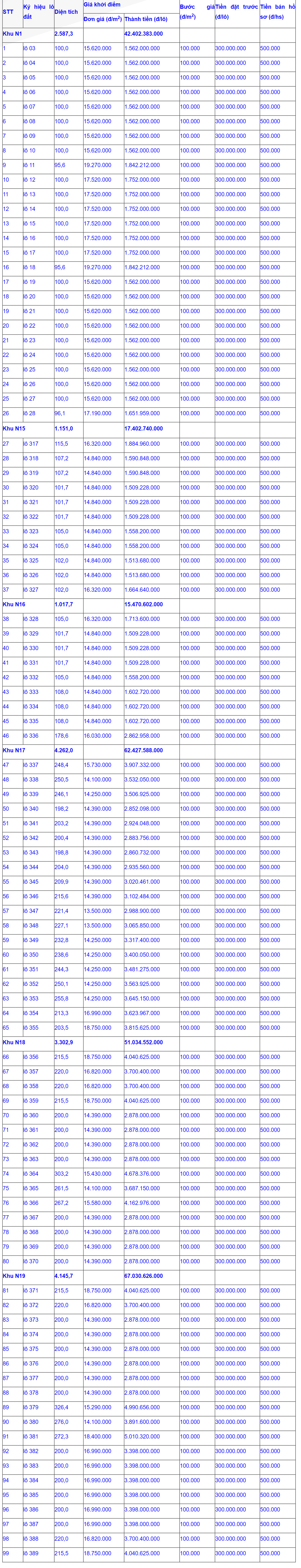 1. Diện tích, giá khởi điểm, bước giá, tiền đặt trước, tiền mua hồ sơ: