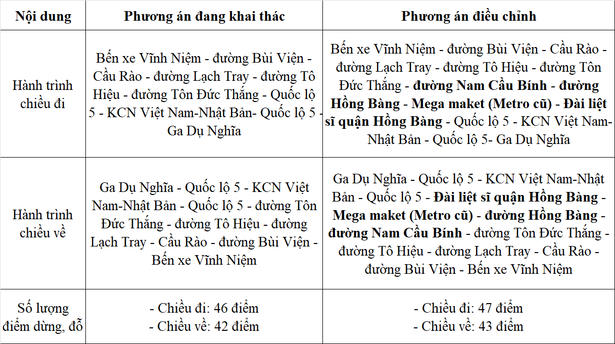 1. Chấp thuận điều chỉnh phương án khai thác tuyến xe buýt số 01: Bến xe Vĩnh Niệm-Ga Dụ Nghĩa với nội dung cụ thể như sau: