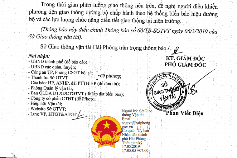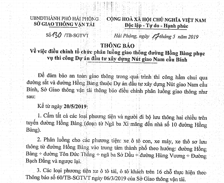 Kể từ ngày 20/5/2019, để đảm bảo an toàn giao thông trong quá trình thi công hầm chui qua đường sắt và đường Hồng Bàng thuộc Dự án đầu tư xây dựng Nút giao Nam cầu Bính, Sở Giao thông Vận tải thông báo điều chỉnh phân luồng giao thông đường Hồng Bàng, phục vụ thi công Dự án đầu tư xây dựng Nút giao Nam cầu Bính, cụ thể như sau: