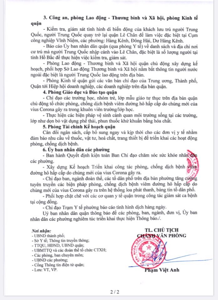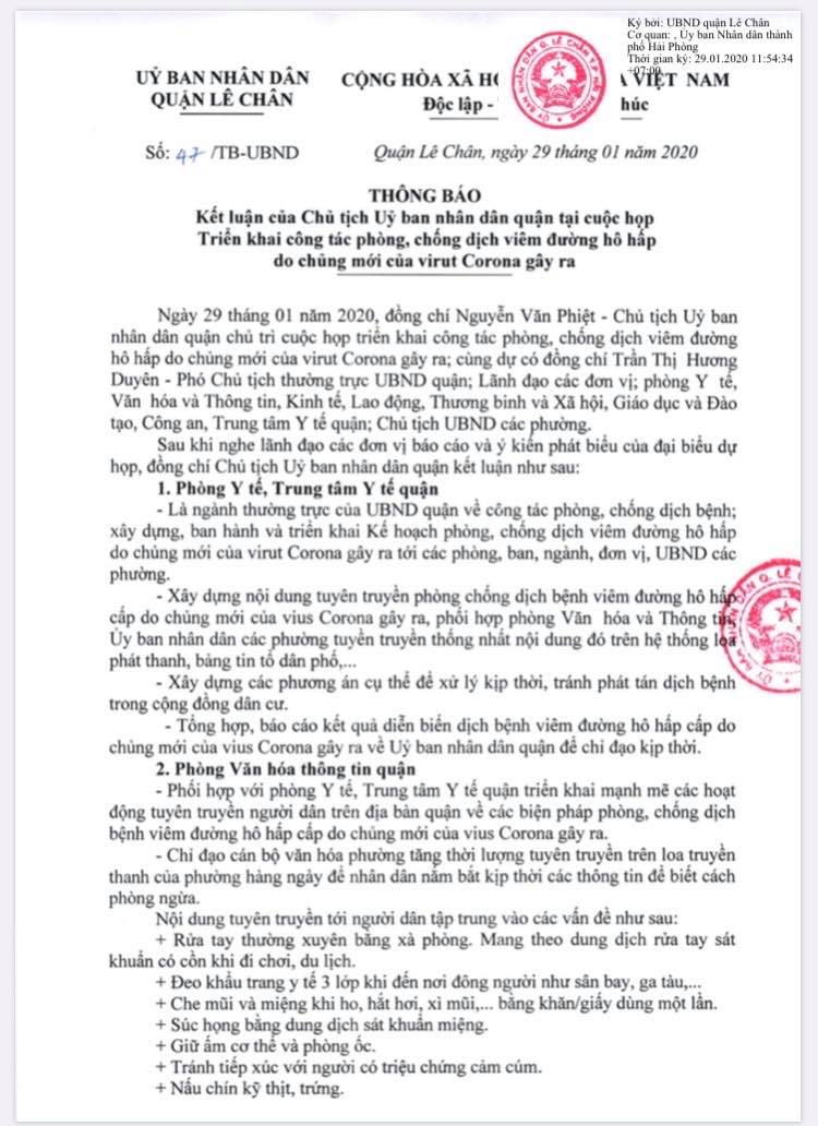 Ngay sau cuộc họp, UBND quận Lê Chân đã ra văn bản Thông báo kết luận của Chủ tịch UBND quận Lê Chân về Triển khai công tác phòng, chống dịch viêm đường hô hấp do chủng mới của virut Corona gây ra.