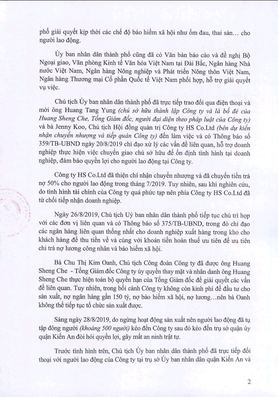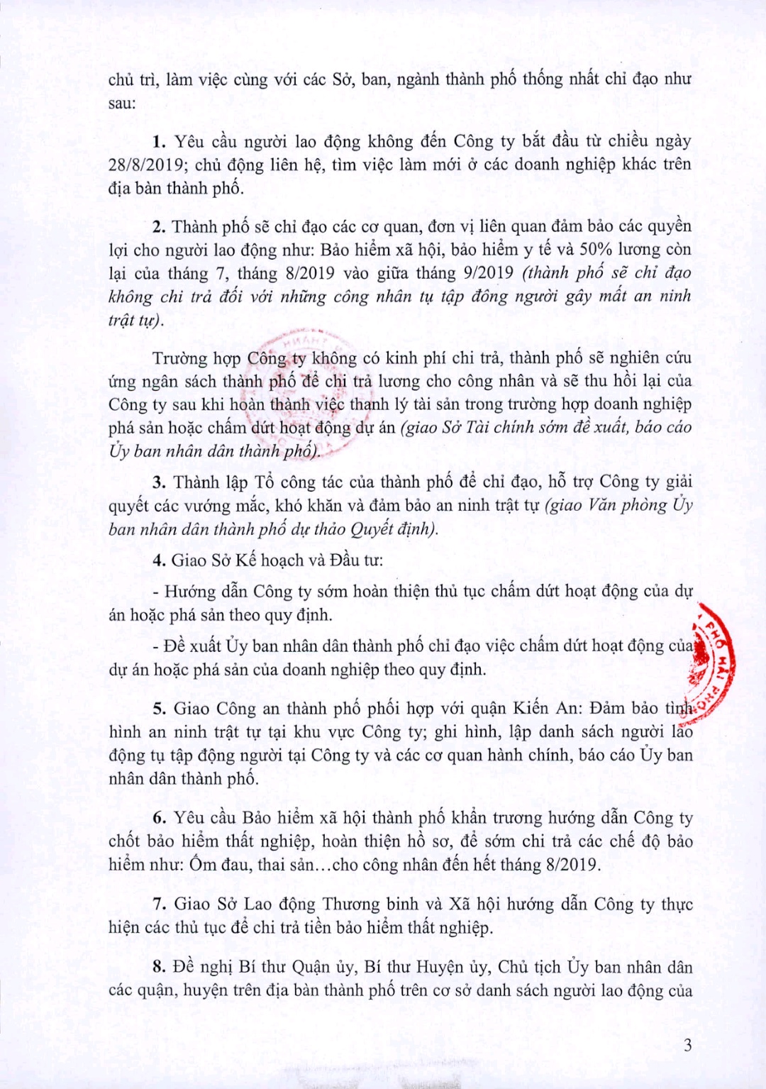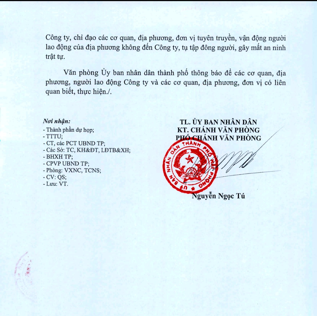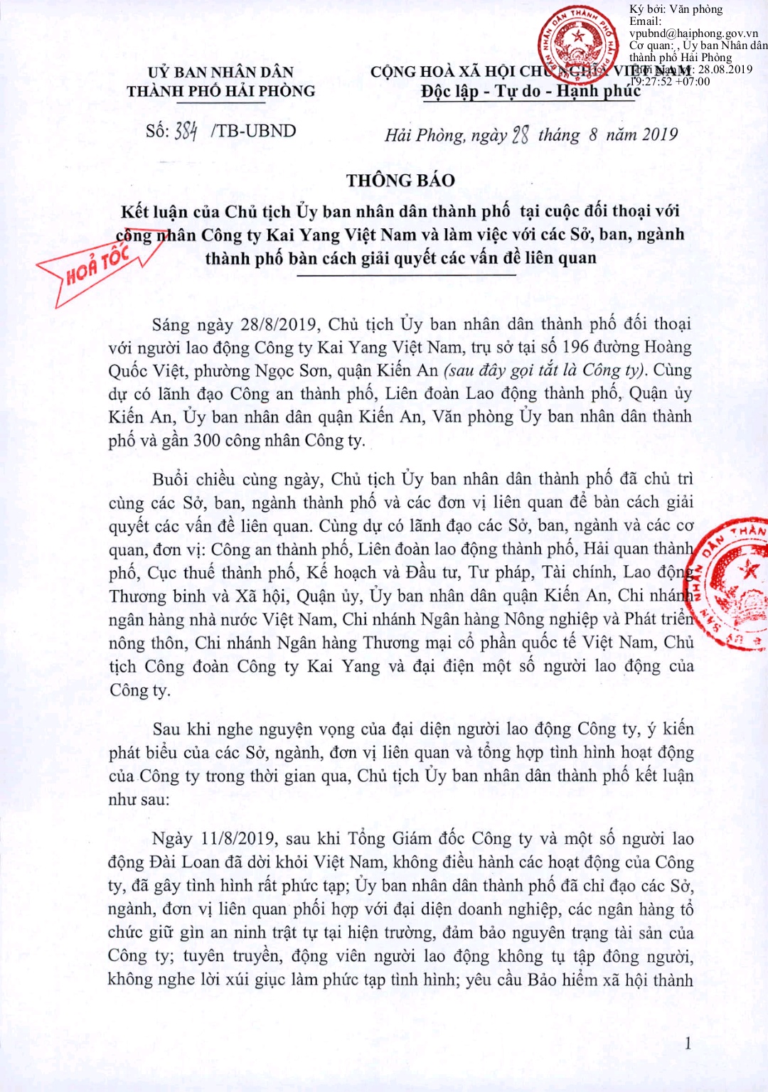 Văn phòng Ủy ban nhân dân thành phố có Thông báo số 384/TB-UBND ngày 28/8/2019 về Kết luận của Chủ tịch Ủy ban nhân dân thành phố tại cuộc đối thoại với công nhân Công ty KaiYang Việt Nam và làm việc với các Sở, ban, ngành thành phố bàn cách giải quyết các vấn đề liên quan.