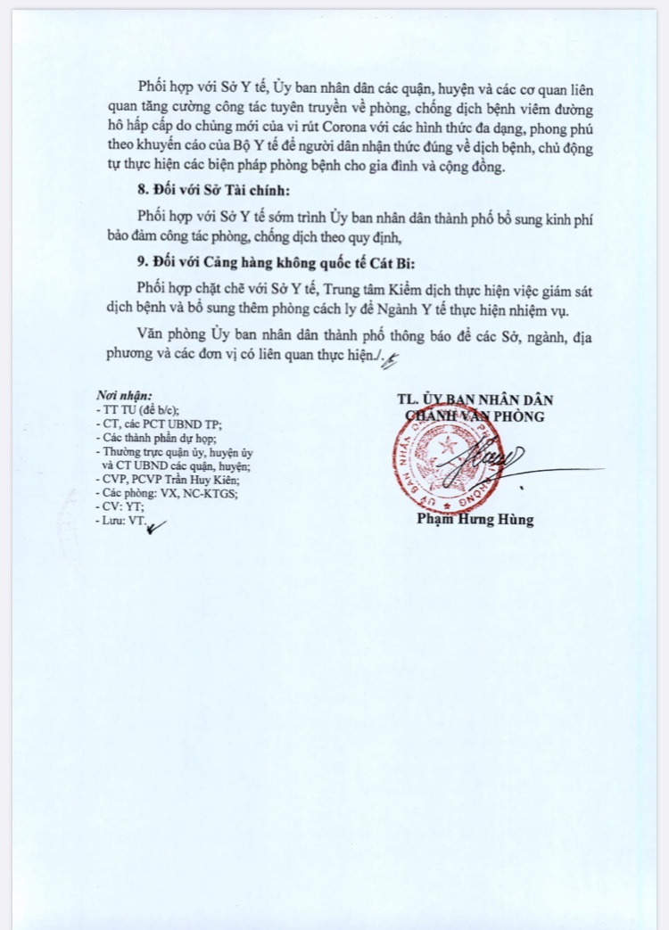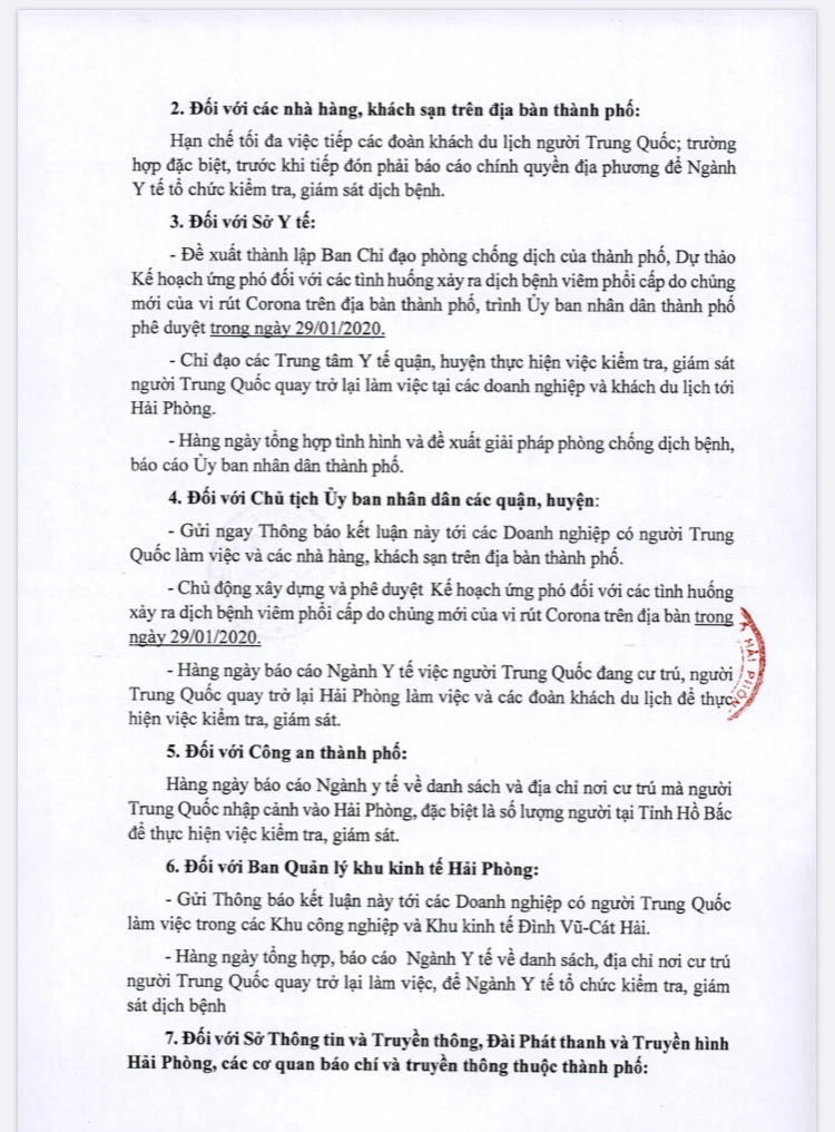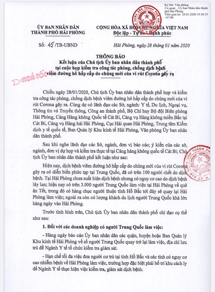 Chiều ngày 28/01/2020, Chủ tịch UBND thành phố họp và kiểm tra công tác phòng chống dịch bệnh viêm đường hô hấp cấp do chủng mới của vi rút Corona gây ra. Cùng dự có lãnh đạo các Sở, ngành: Y tế, Du lịch, Ngoại vụ, Thông tin và Truyền thông, Công an thành phố, Bộ Chỉ huy Bộ đội Biên phòng Hải Phòng, Cảng Hàng không Quốc tế Cát Bi, Cảng vụ Hàng không miền Bắc tại Cát Bi, Cảng vụ Hàng hải Hải Phòng, Cục Hải quan Hải Phòng, Trung tâm Kiểm dịch y tế quốc tế, Ban Quản lý Khu kinh tế Hải Phòng, Văn phòng UBND thành phố.