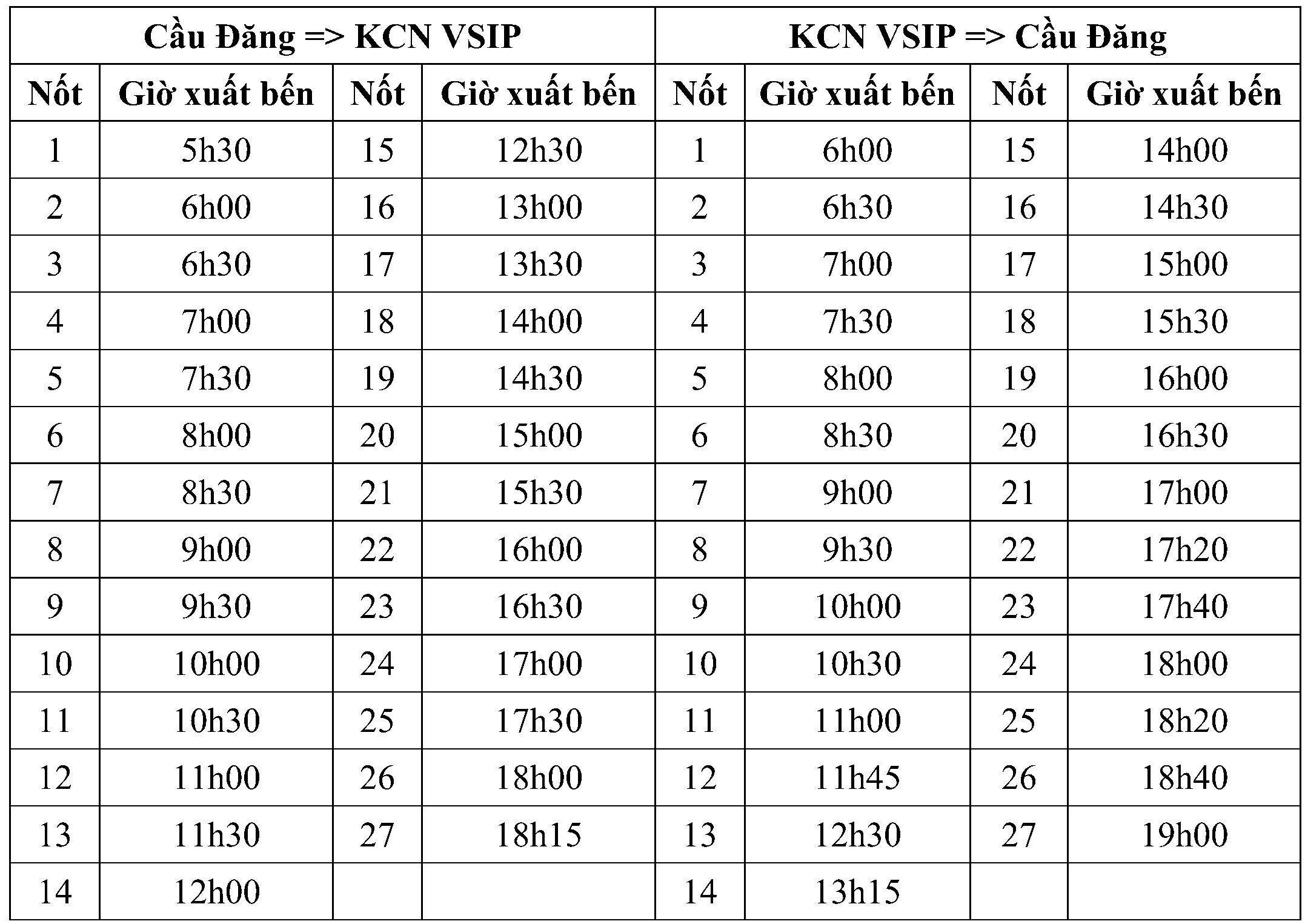 + Cầu Đăng: Từ 05h30’-18h15’ hàng ngày.