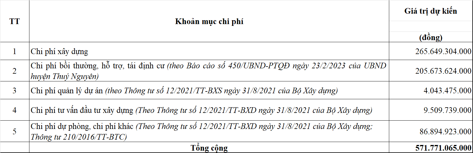 Tổng vốn đầu tư dự kiến (bao gồm sơ bộ chi phí bồi thường, hỗ trợ, tái định cư): 571.771.065.000 đồng (Bằng chữ: Năm trăm bảy mươi mốt tỷ bảy trăm bảy mươi mốt triệu không trăm sáu mươi lăm nghìn) đồng, cụ thể:
